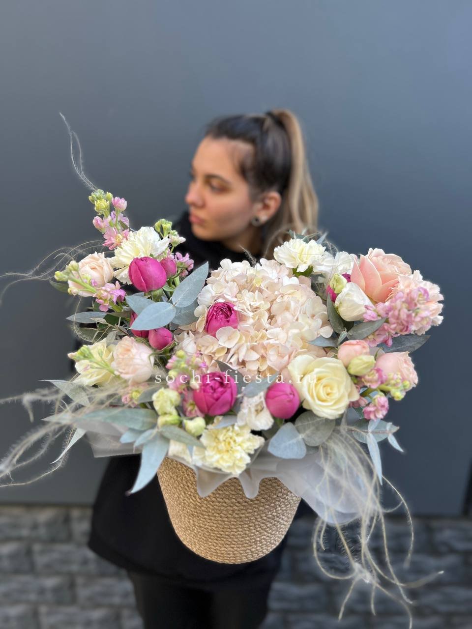 пионовидные розы Мисти Бабблс, гортензия, розы, диантусы, эустома, маттиола, джутовое кашпо, стифа, эвкалипт.