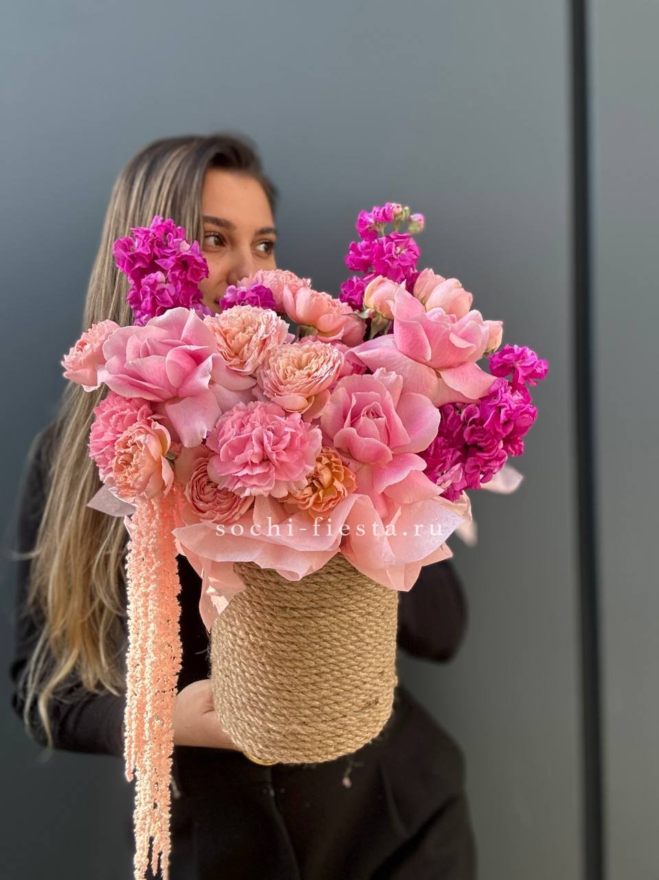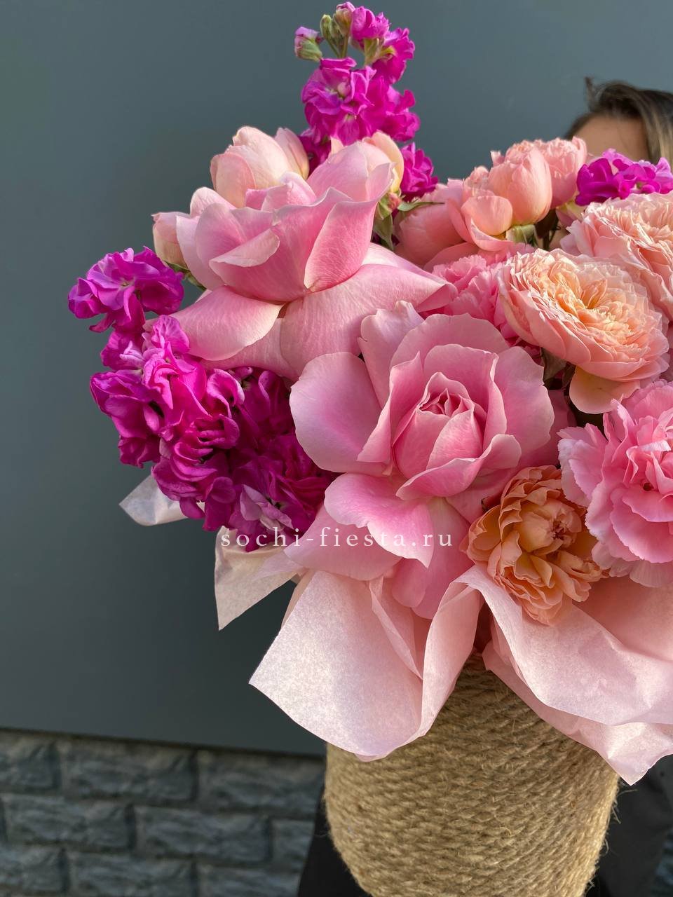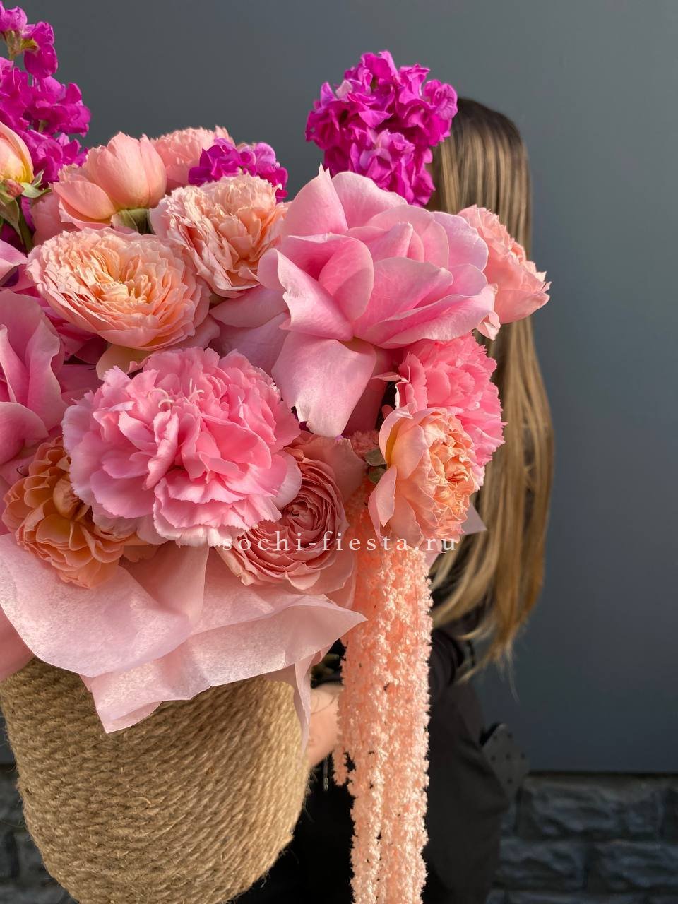 маттиола, французские розы, кустовые пионовидные розы, дианутсы, амарантус.