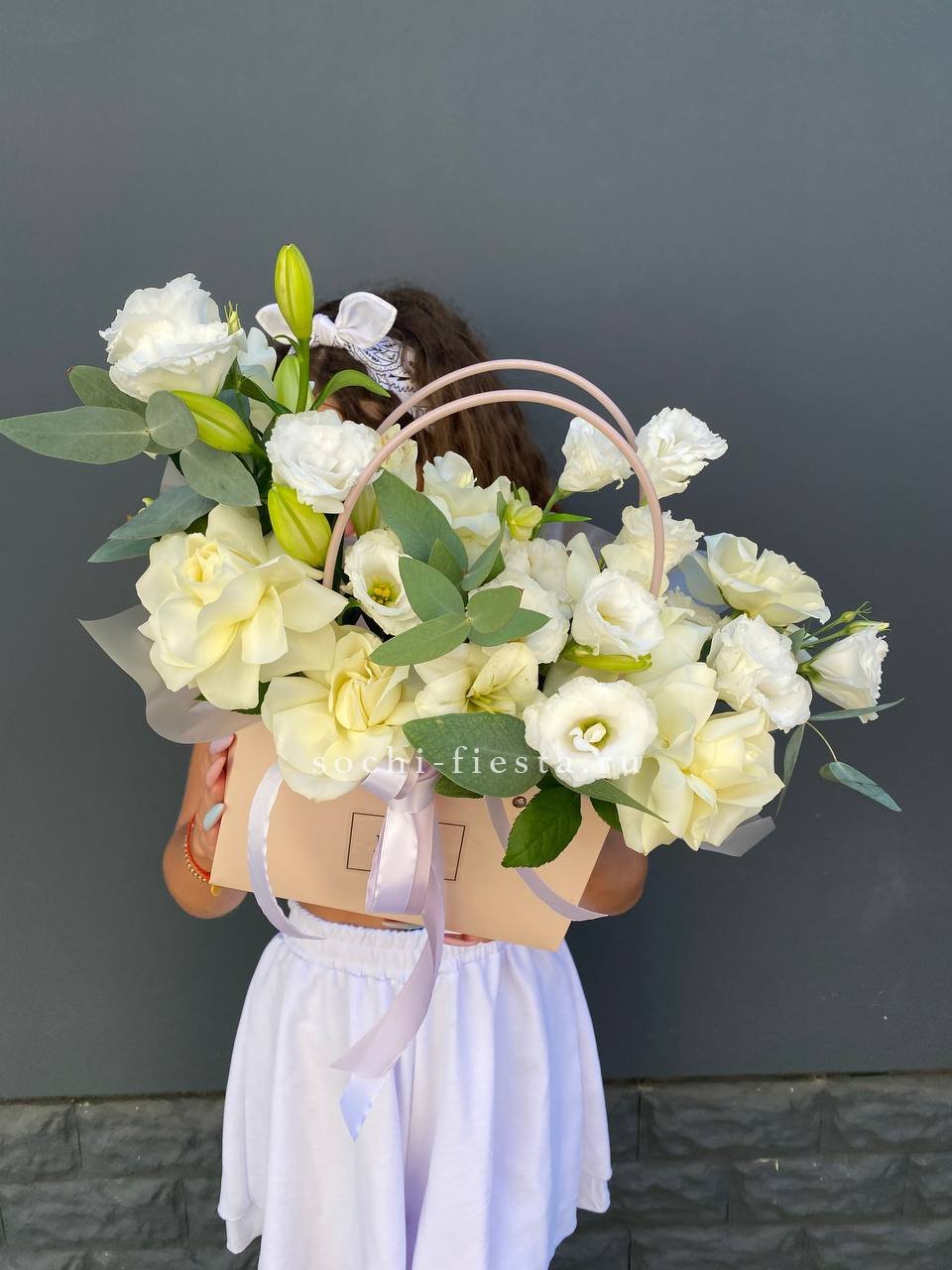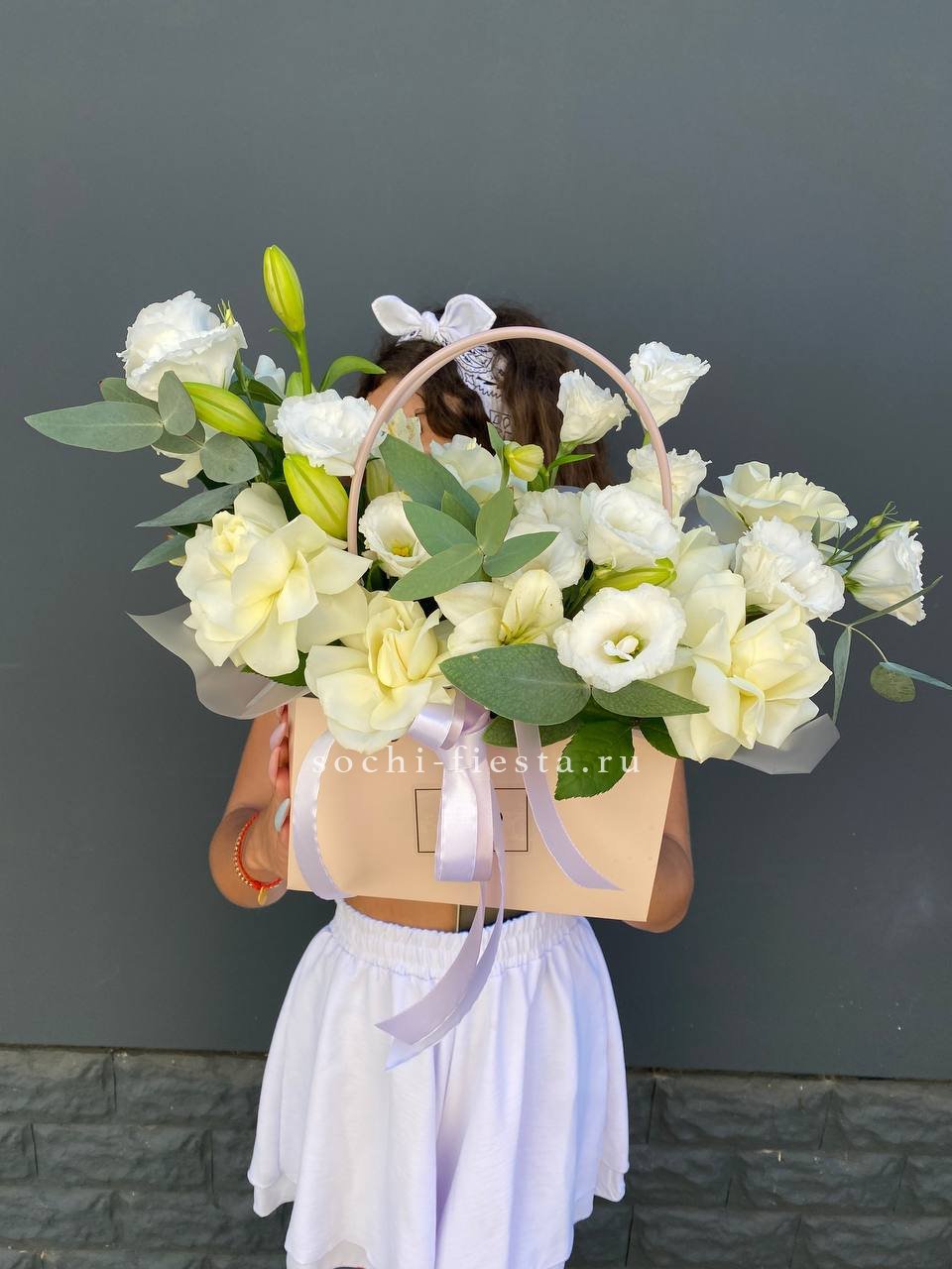 эустома, французские розы, эвкалипт, лилия, сумочка, оазис.