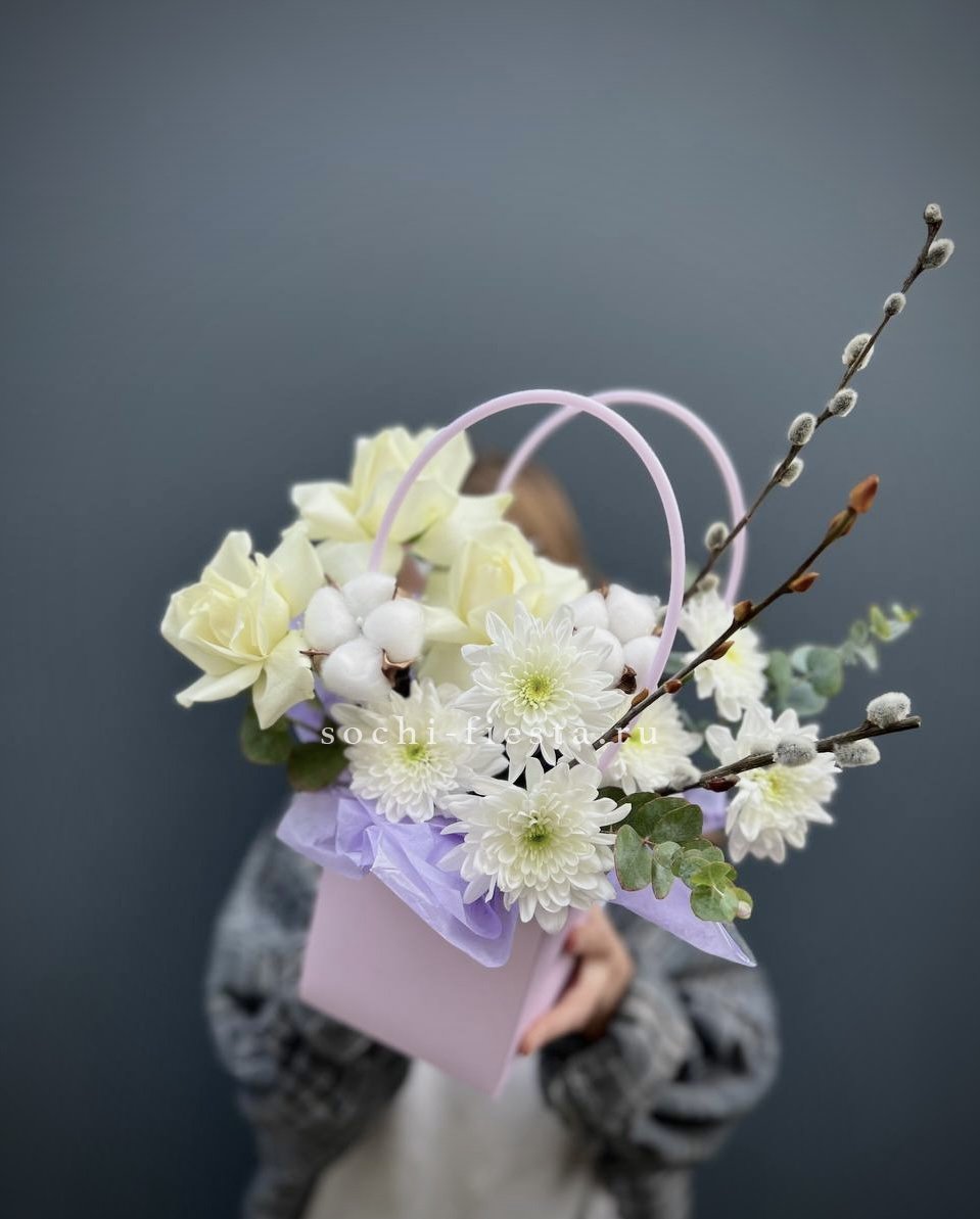 Голубая гортензия задаёт тон всей композиции, где хризантема и эустома создают объём, а хлопок с лагурусом добавляют воздушности. Сумочка вмещает насыщенную палитру без перегруженности.