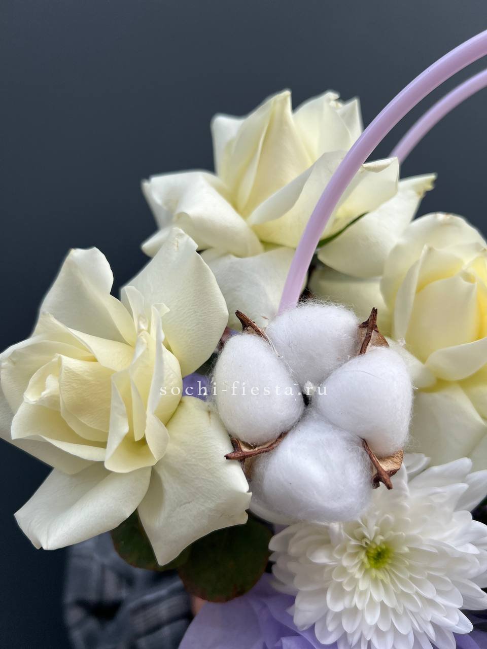 хризантема, эустома, гортензия, белая роза, хлопок, лагурус.
