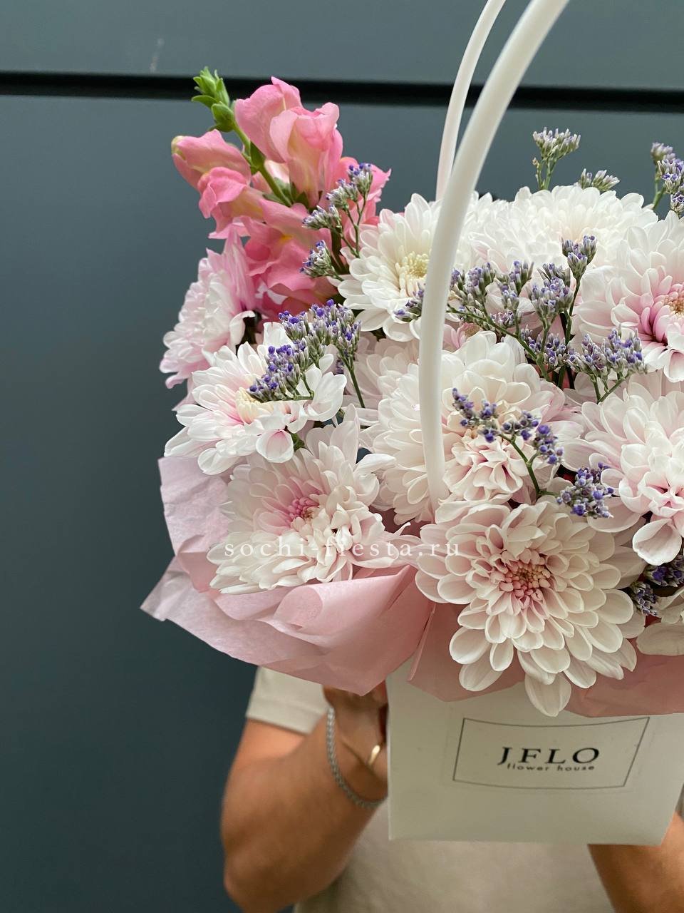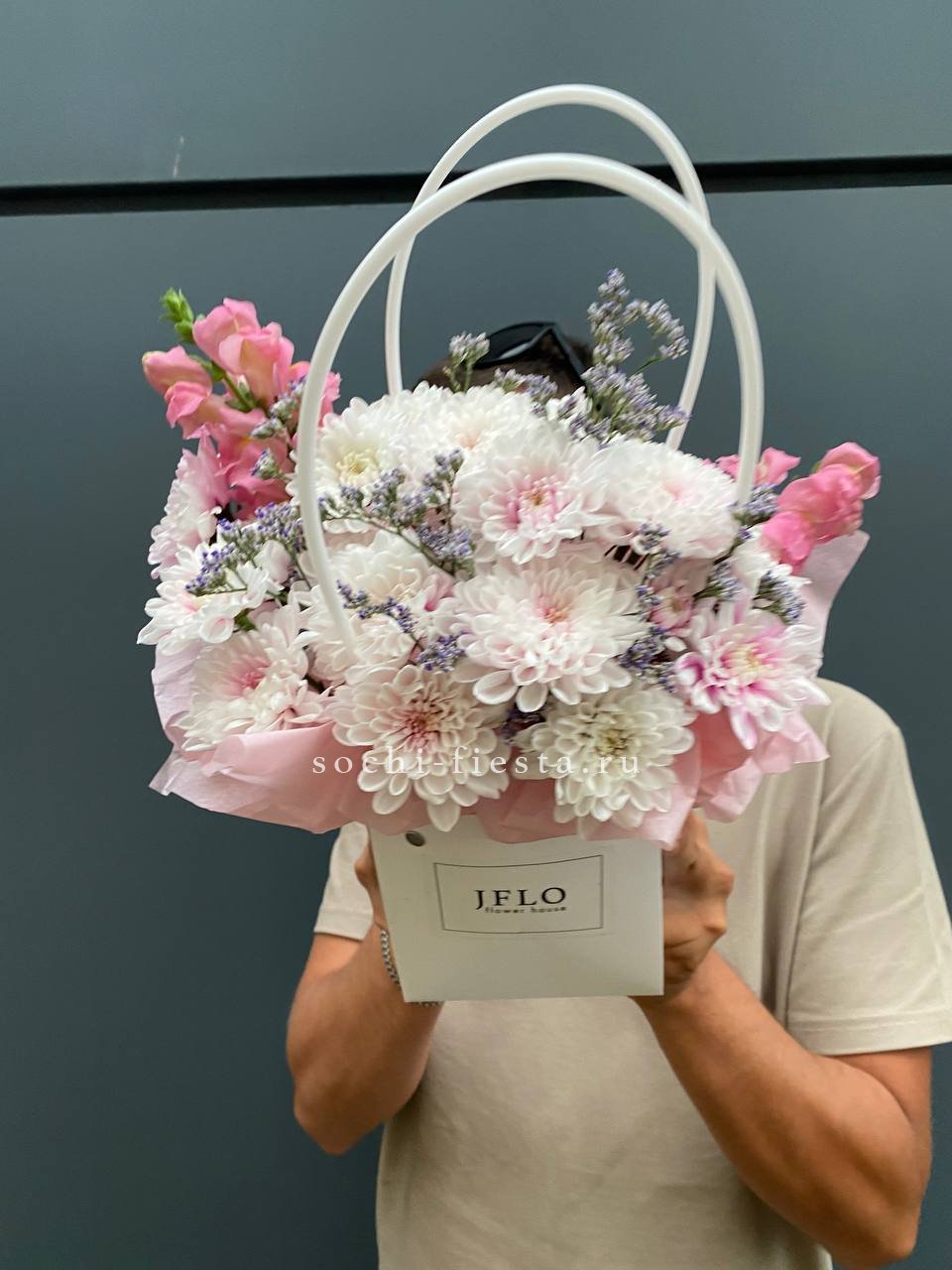 Хризантемы и львиный зев собраны в удобную сумочку с плотной структурой. Лимониум добавляет воздушности между яркими соцветиями. Композиция сохраняет свежесть долго и не требует особого ухода.