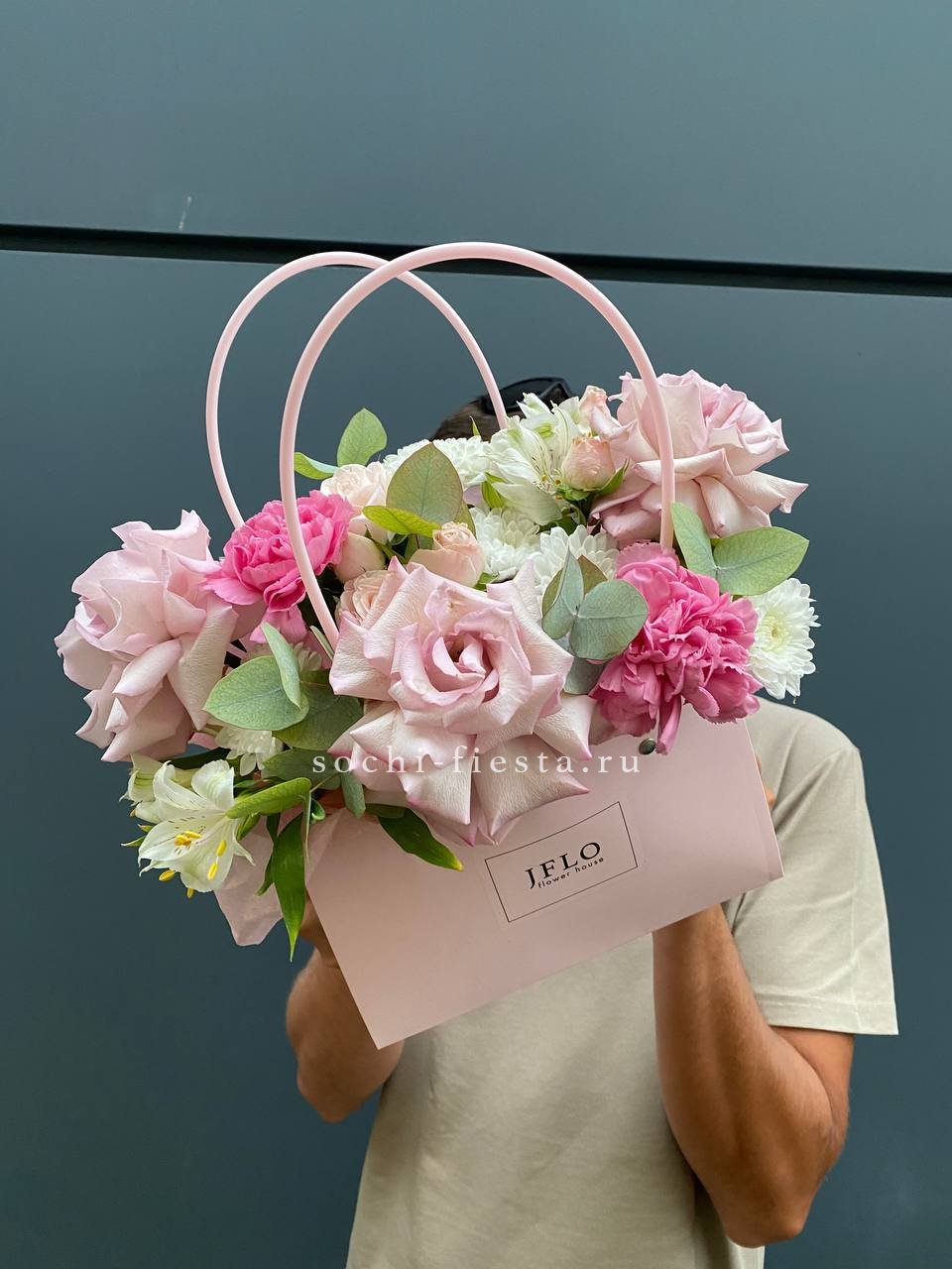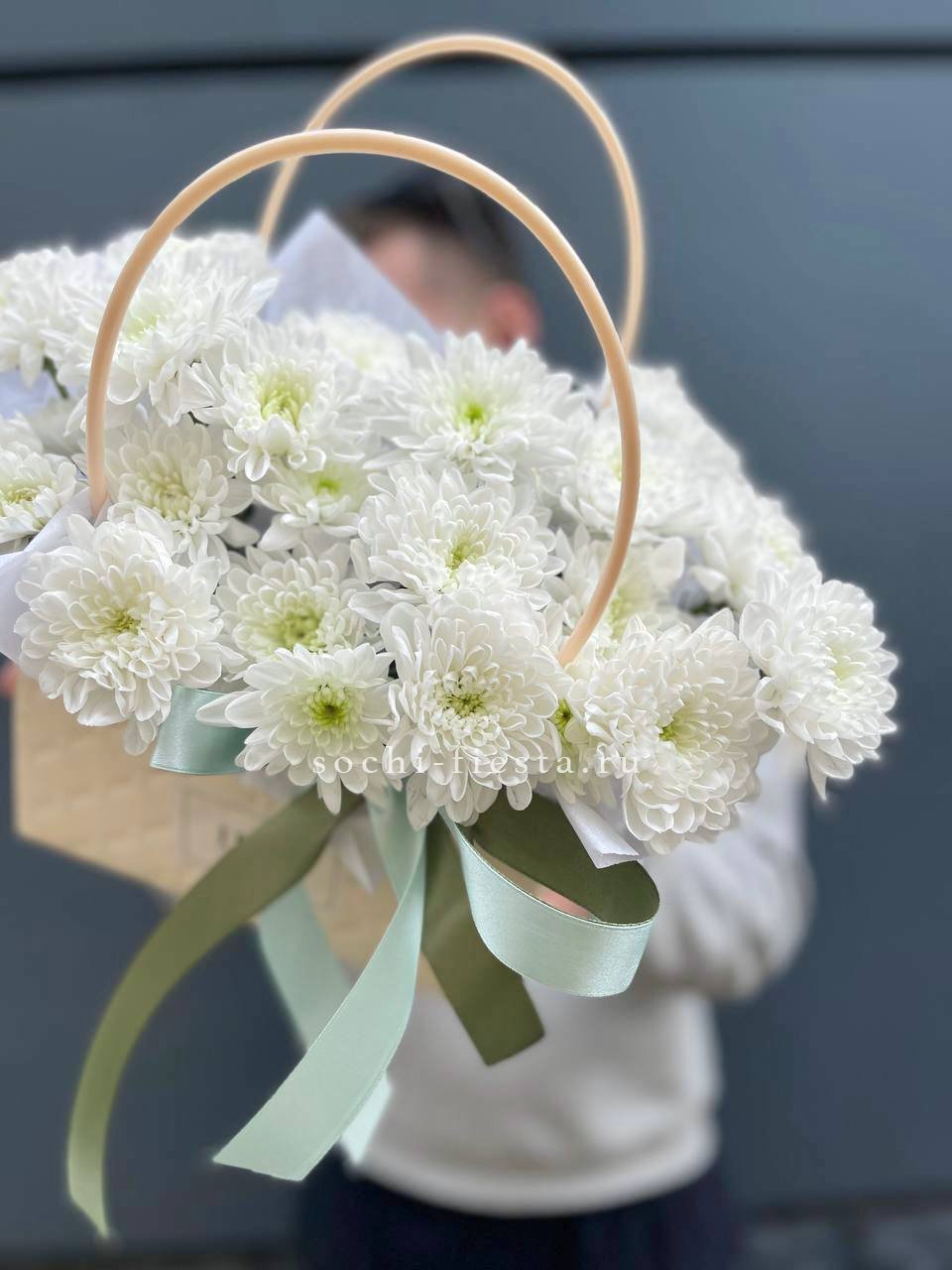 Компактная сумочка с кустовыми хризантемами создаёт уютное настроение. Живые соцветия собраны в удобной форме, которая легко размещается на столе или полке.