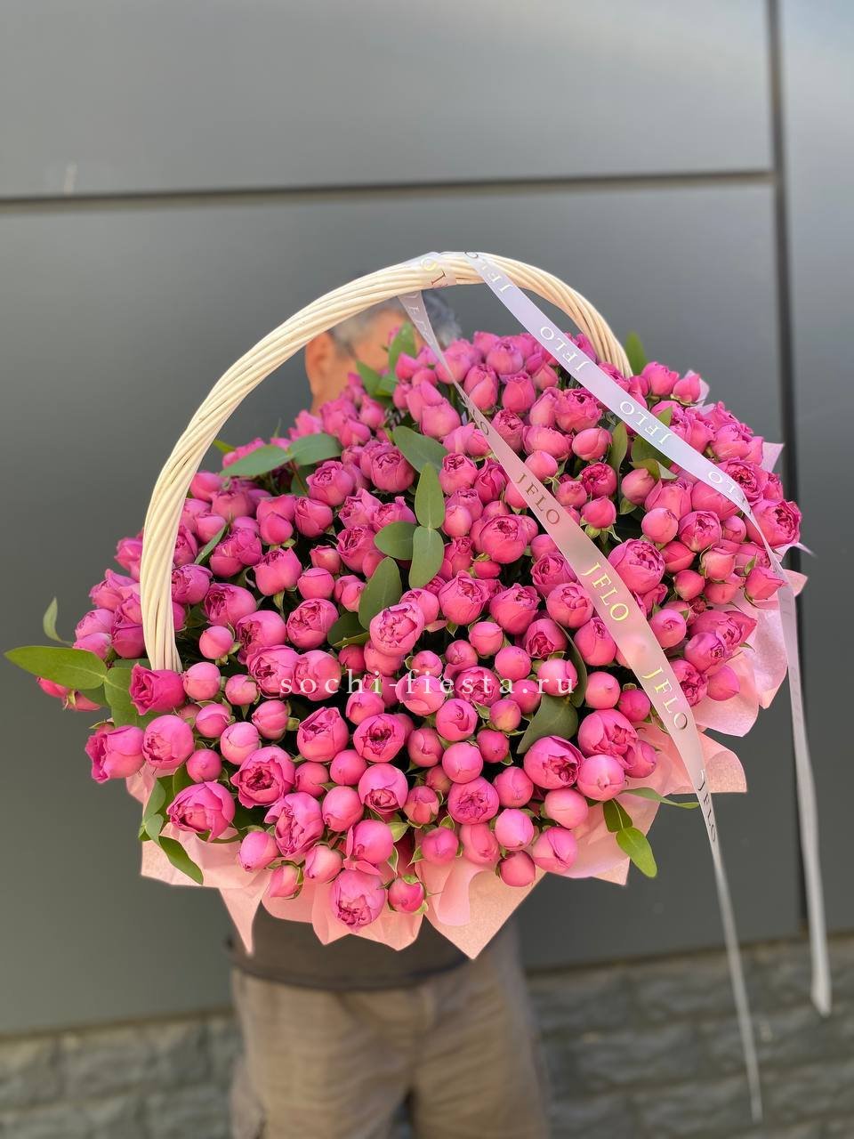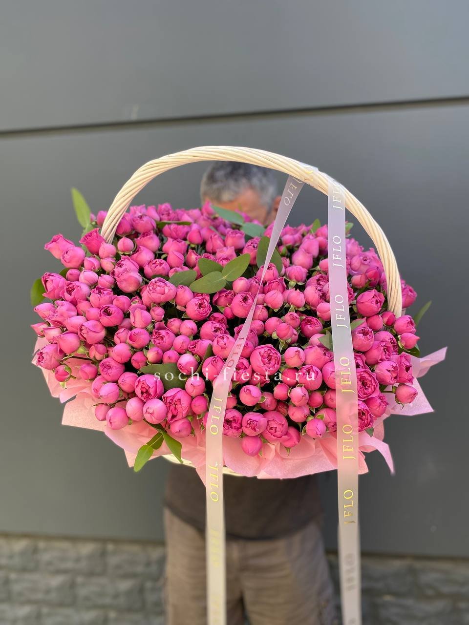 65 пионовидных кустовых роз в корзине