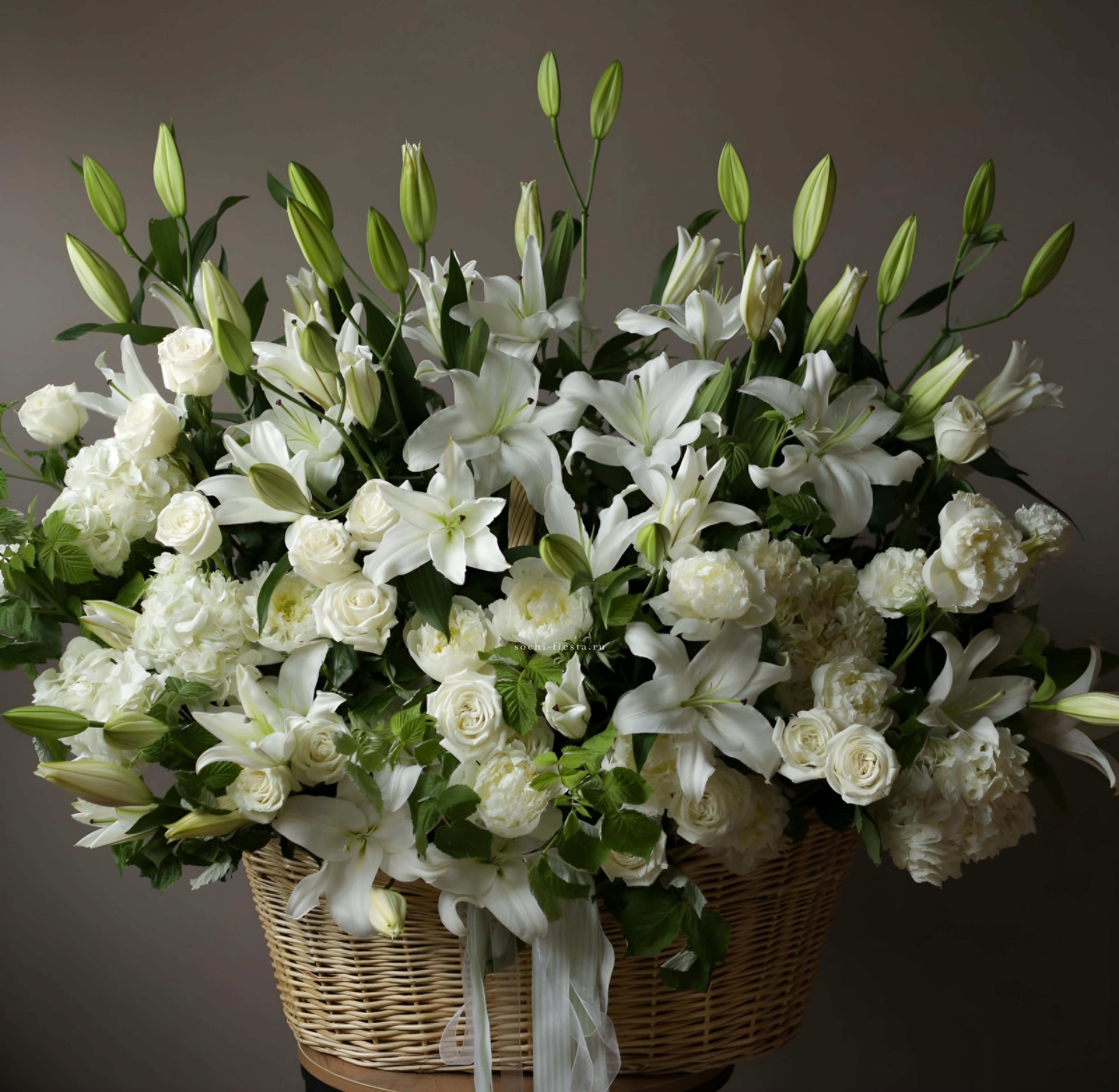 Эта роскошная интерьерная корзина — настоящее воплощение цветущего сада, наполненного нежностью и свежестью. Она выглядит невероятно объемной и фактурной благодаря гармоничному сочетанию классических и экзотических цветов.