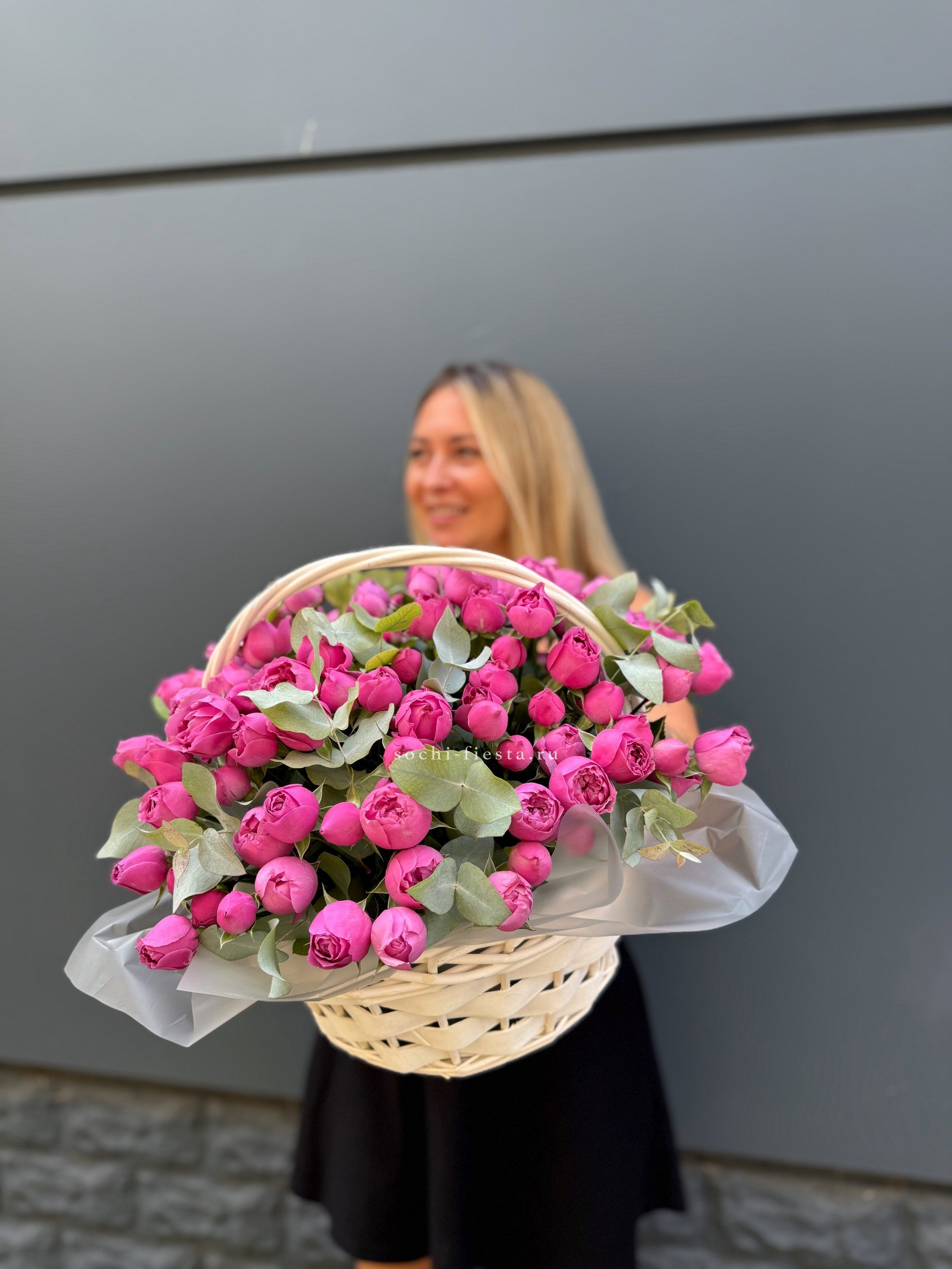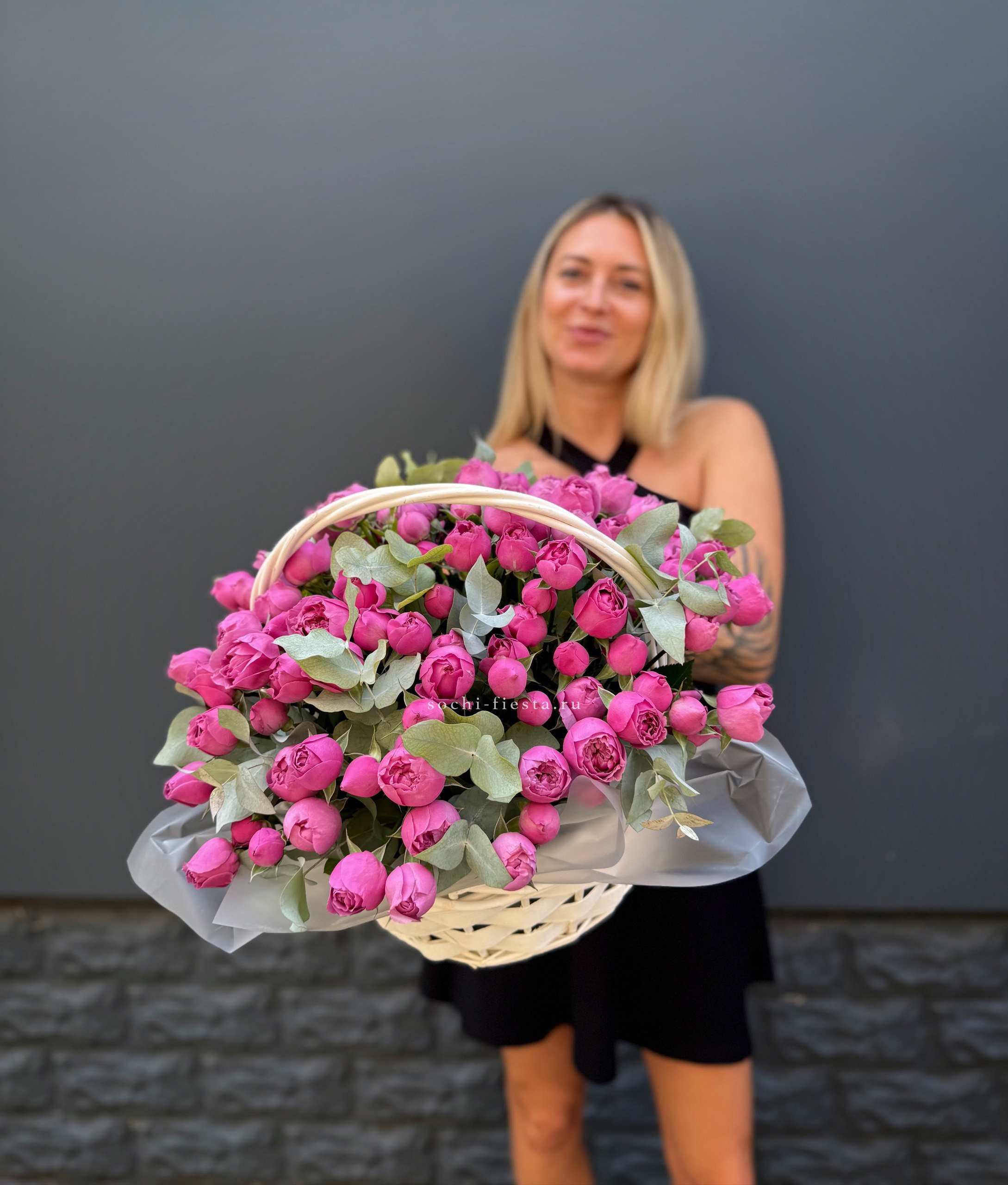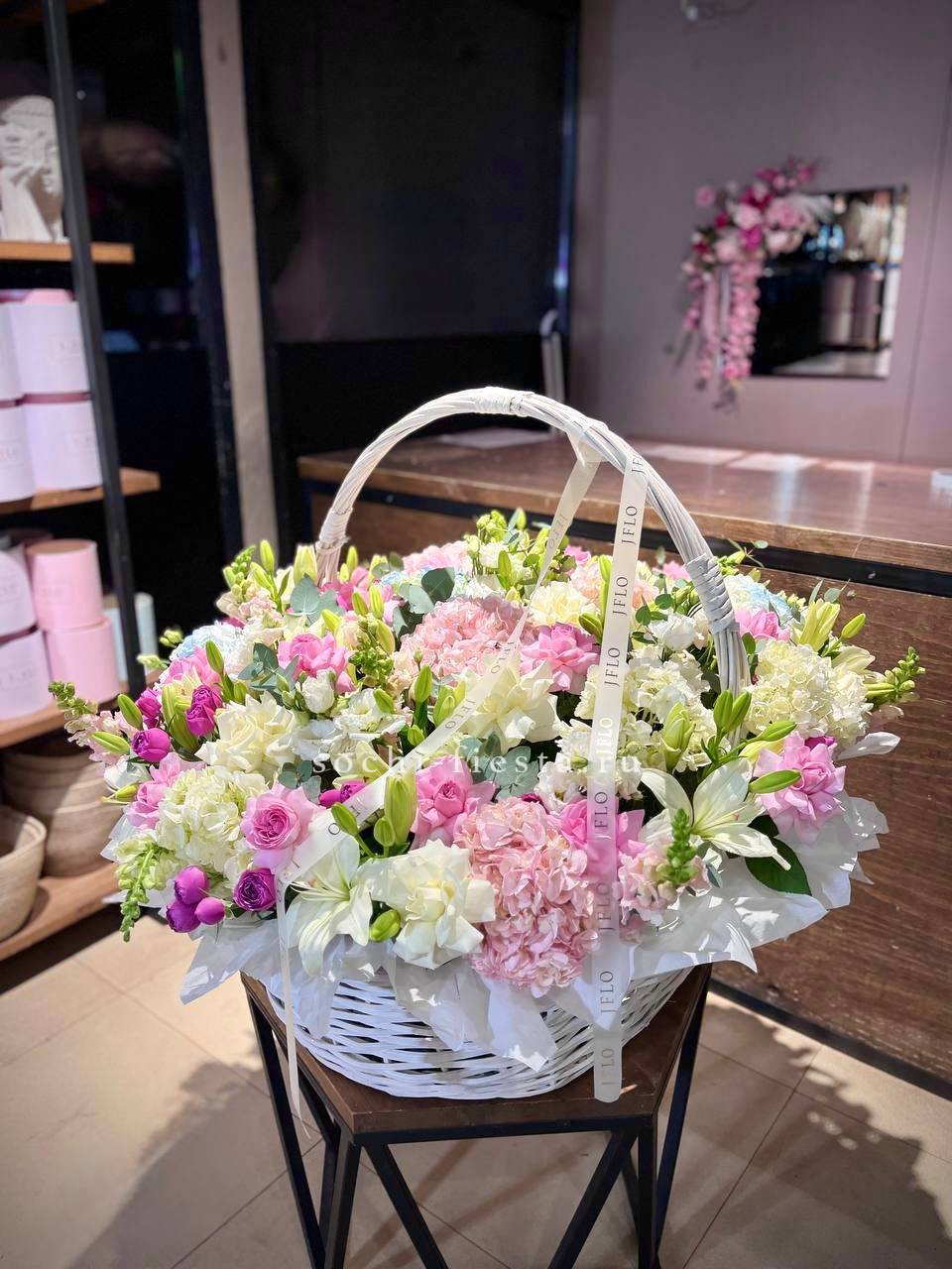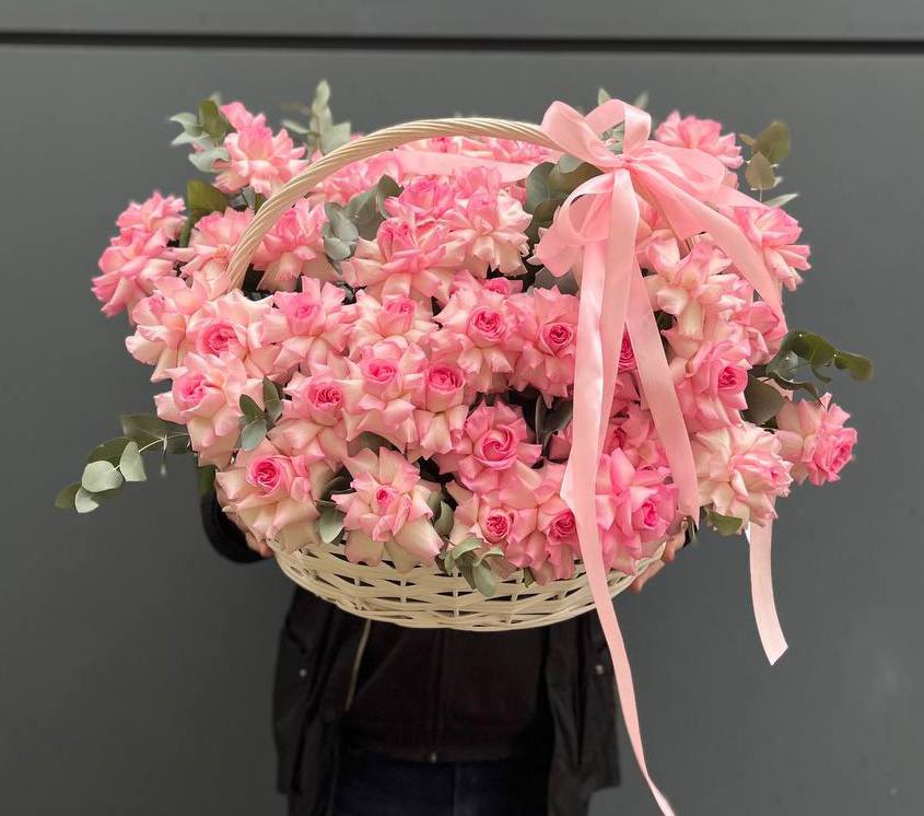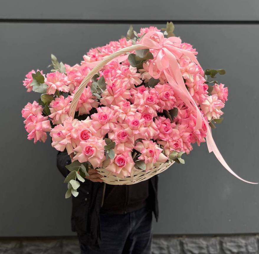 цветочная корзина с розами, мисти баблс, диантусами и гортензией.