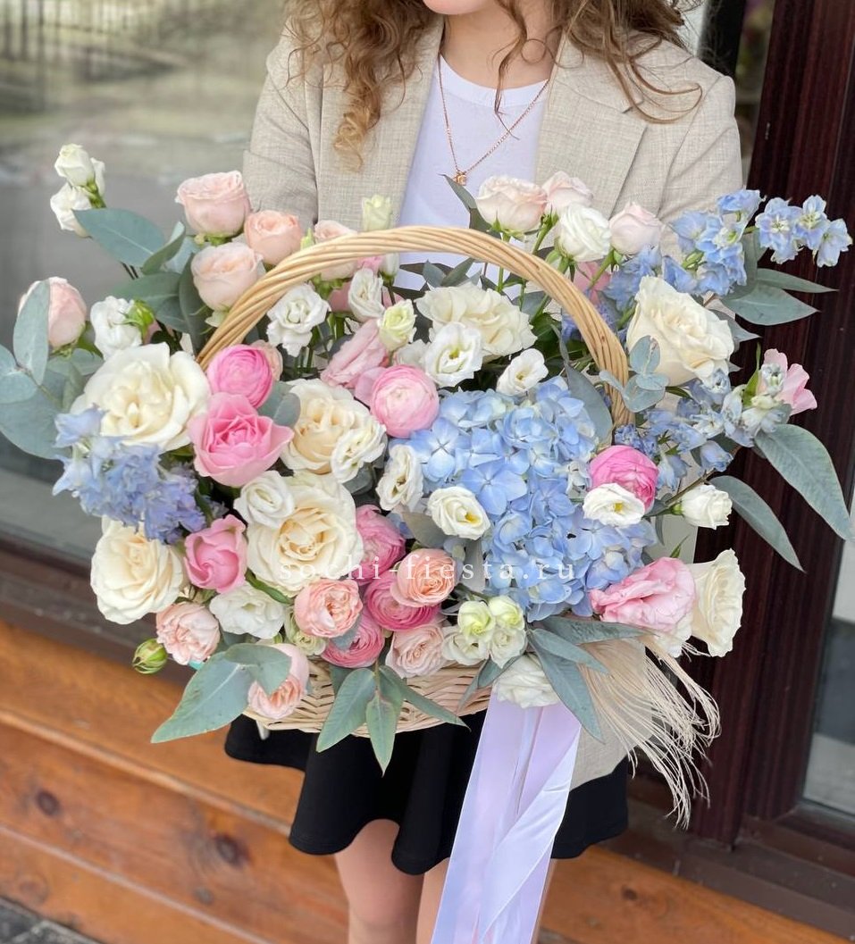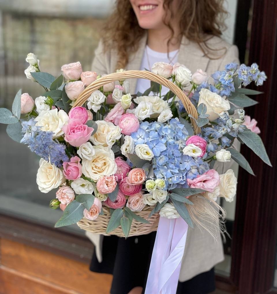 Пышная корзина с розами и гортензиями собрана плотно и объёмно. Маттиола добавляет живую текстуру между крупными соцветиями, а кустовые розы заполняют композицию мягкими переходами. Результат — впечатляющее присутствие, которое меняет восприятие пространства.