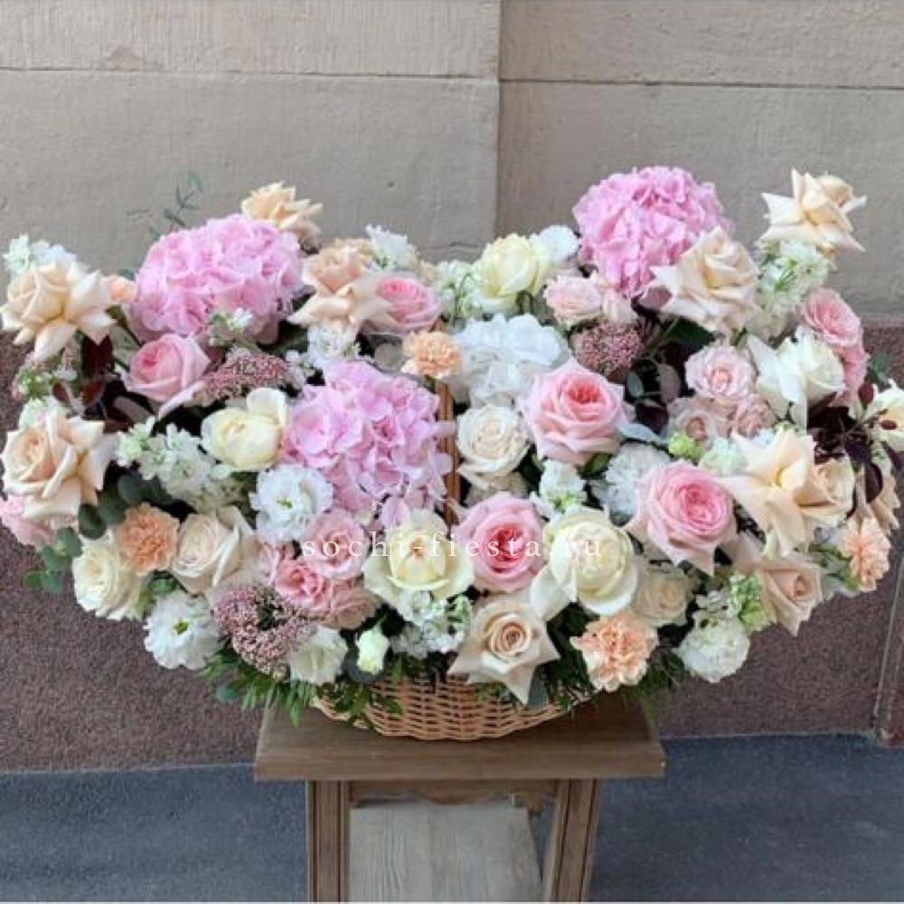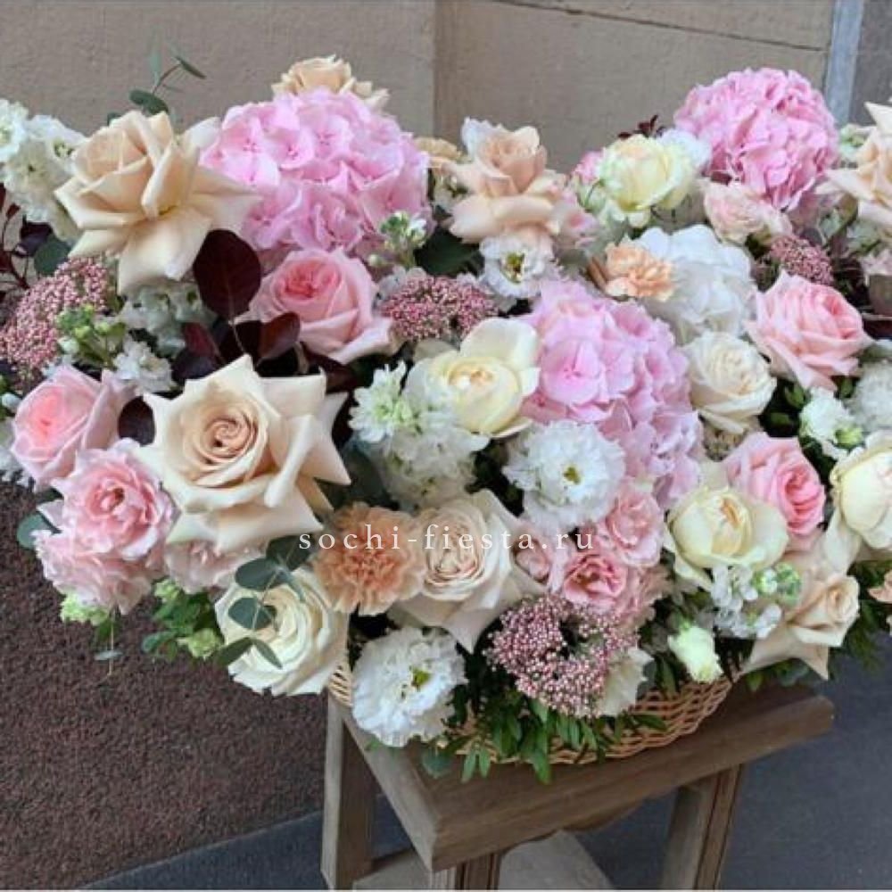 Пышная корзина объединяет пионовидные розы с воздушной гортензией и многослойной эустомой. Матиолла и лимониум добавляют глубину композиции, а диантус создает мягкие переходы между крупными бутонами.
