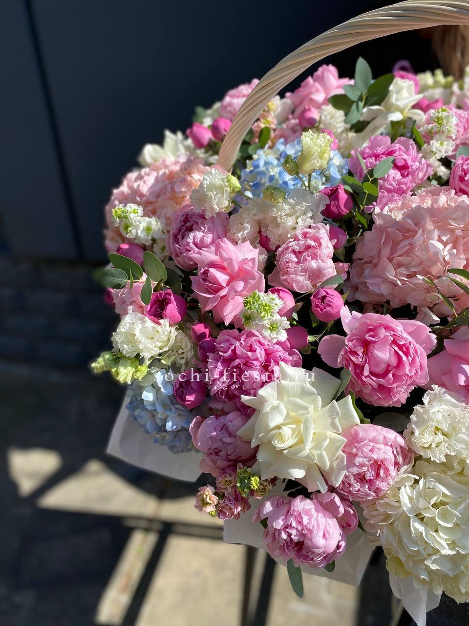 гербера, гортензия, диантус, хайди, эустома, эвкалипт, корзина средняя.