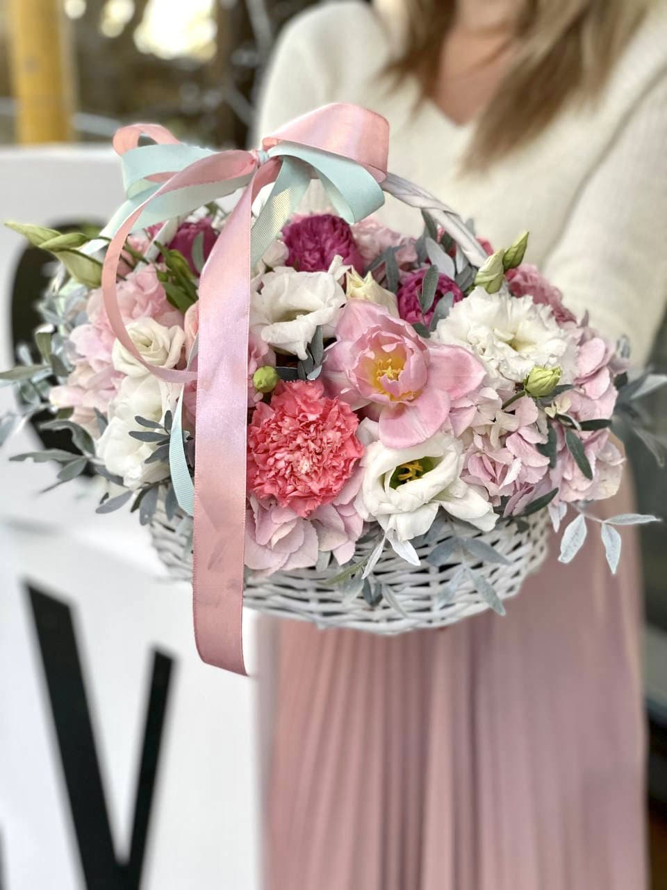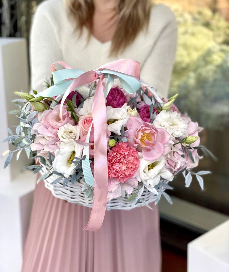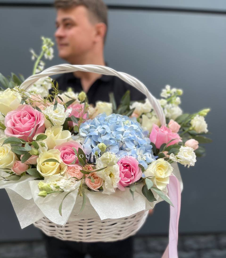 Гортензия и эустома задают объём, а яркие герберы расставляют цветовые акценты по всей композиции. Диантус и хайди добавляют воздушности, эвкалипт завершает силуэт мягкими линиями. Корзина держит форму и создаёт устойчивую основу для пышной композиции.