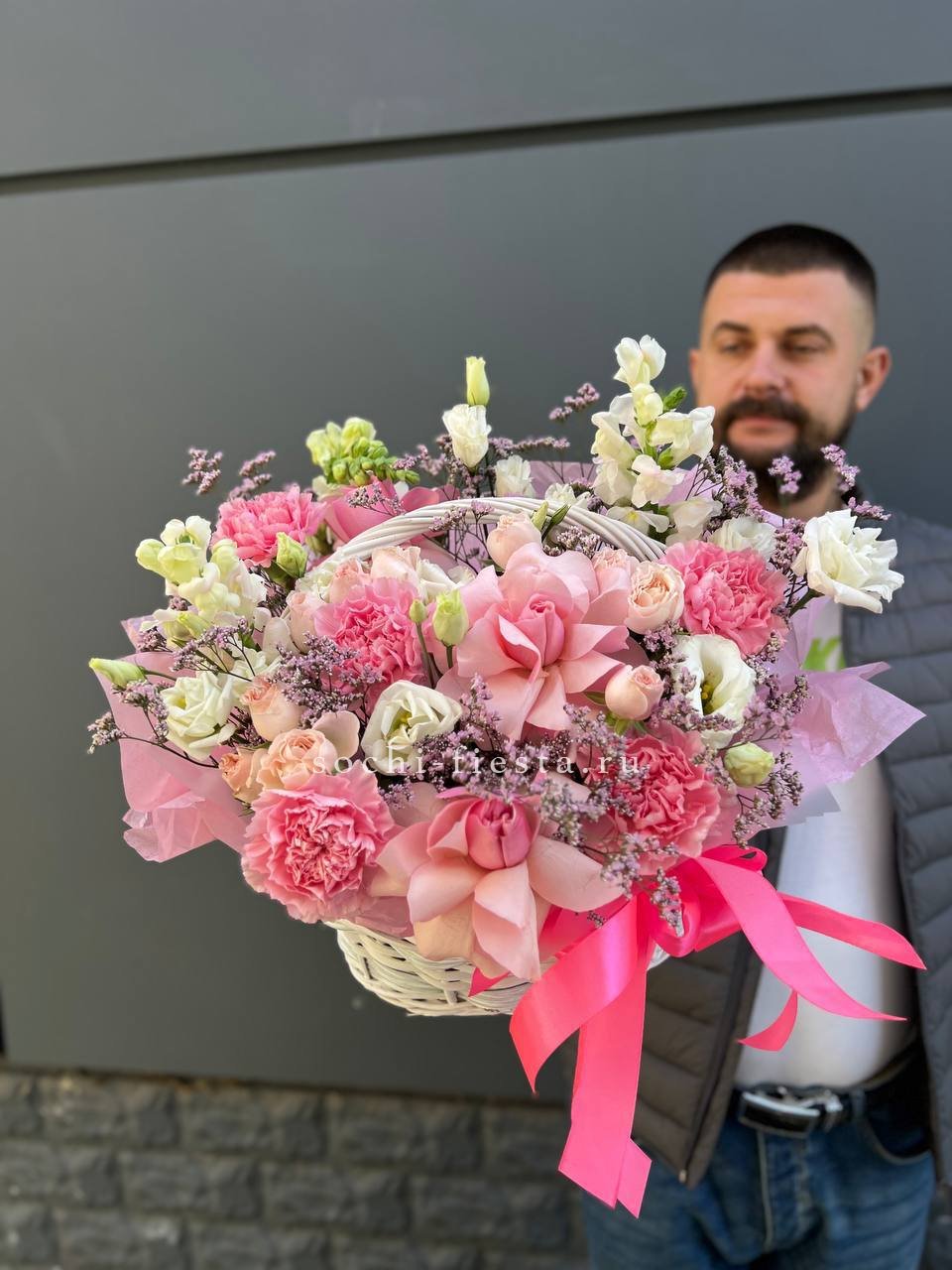 роза одноголовая, эустома, гортензия, мисти баблс, диантус, декоративная зелень, корзина D20. Итоговая корзинка может иметь композиционные отличия в зависимости от сезонности компонентов. При этом внешний вид, объем, цена компонентов, а также цветовая гамма композиции будут соответствовать оригиналу.