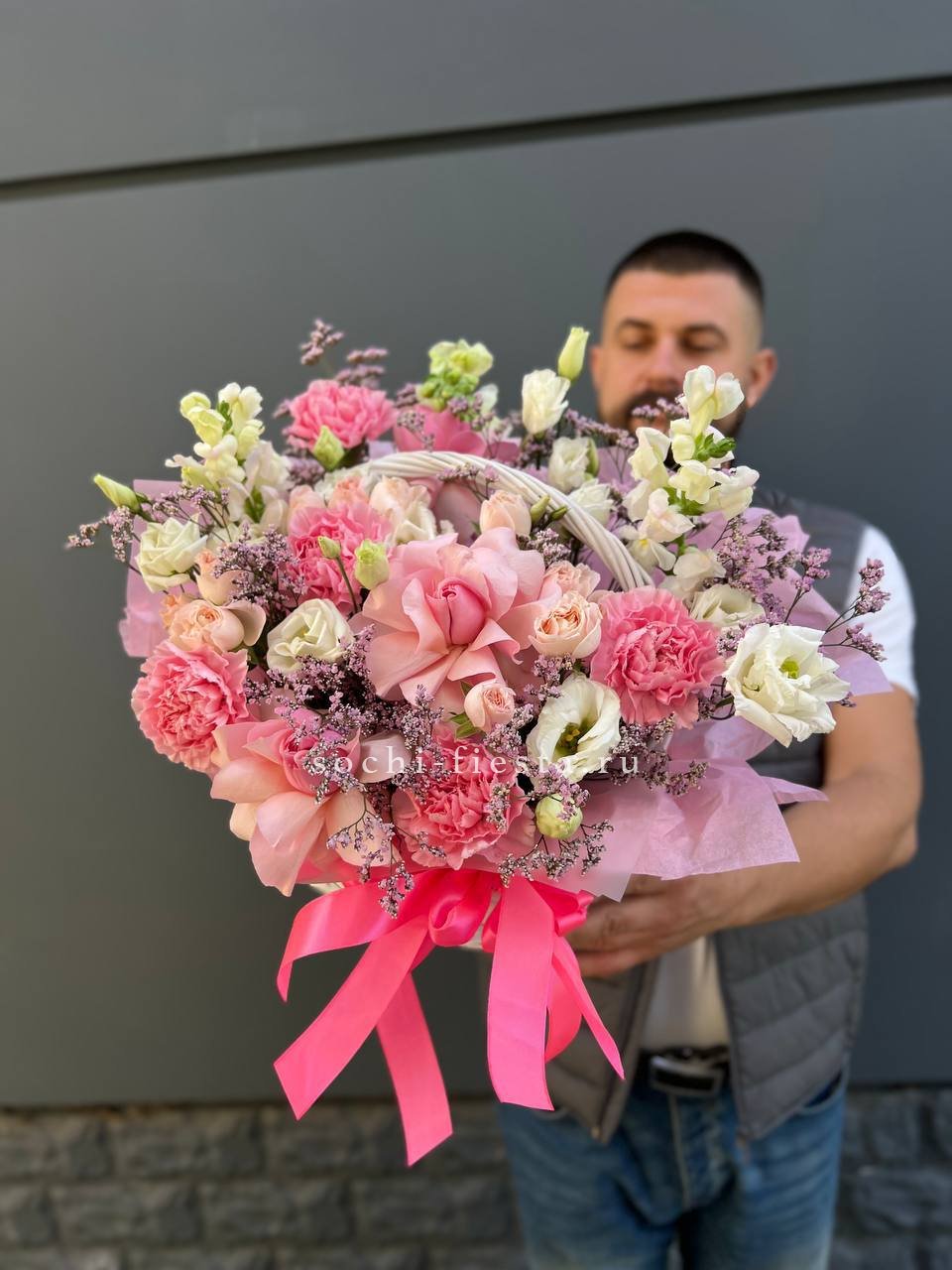 Композиция в плетёной корзине собрана из роз, эустомы, гортензии и диантуса с добавлением воздушного мисти баблс. Каждый цветок находит своё место в общем ритме, создавая гармоничную картину. Готовое решение для дома или в подарок близким.