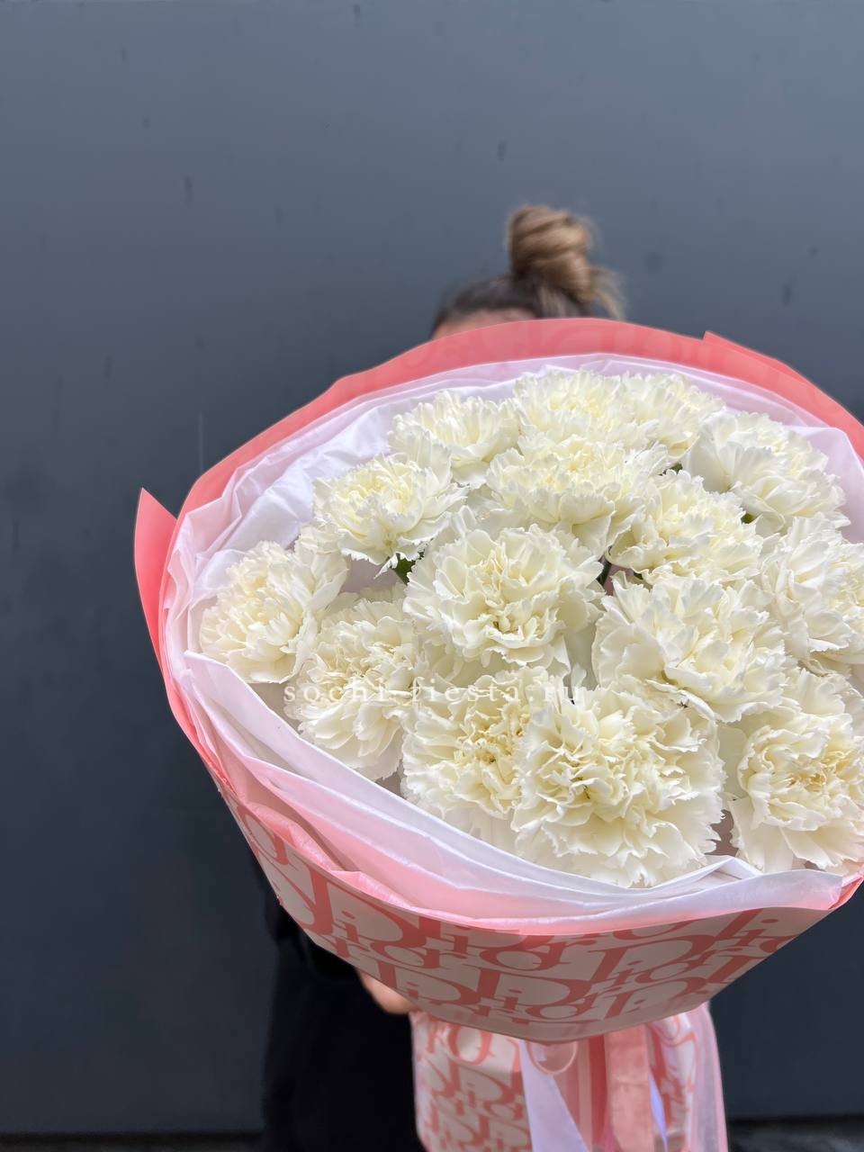 Букет из пятнадцати белых диантусов вписывается в любое пространство благодаря компактной форме. Цветы долго сохраняют свежесть и не требуют сложного ухода.