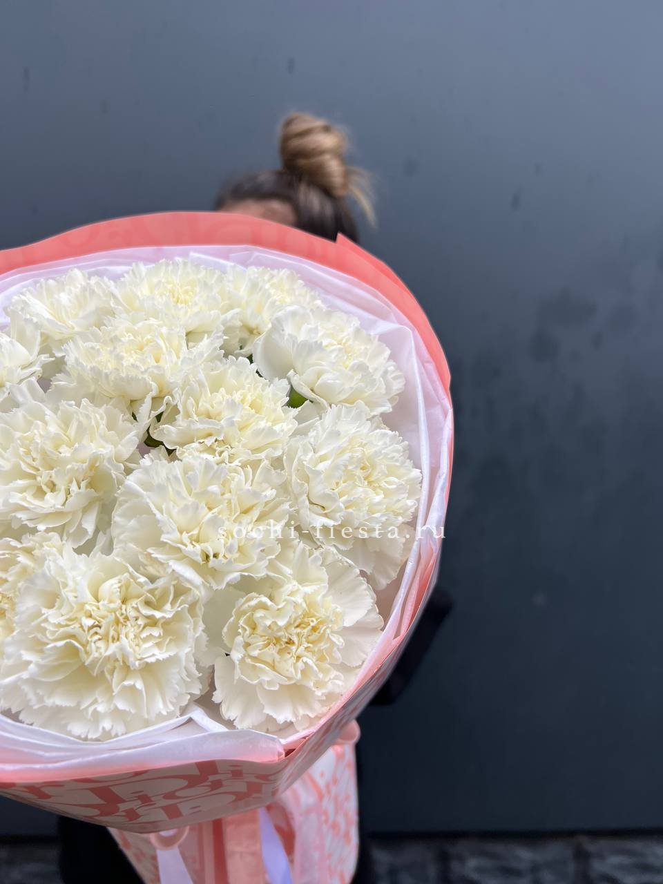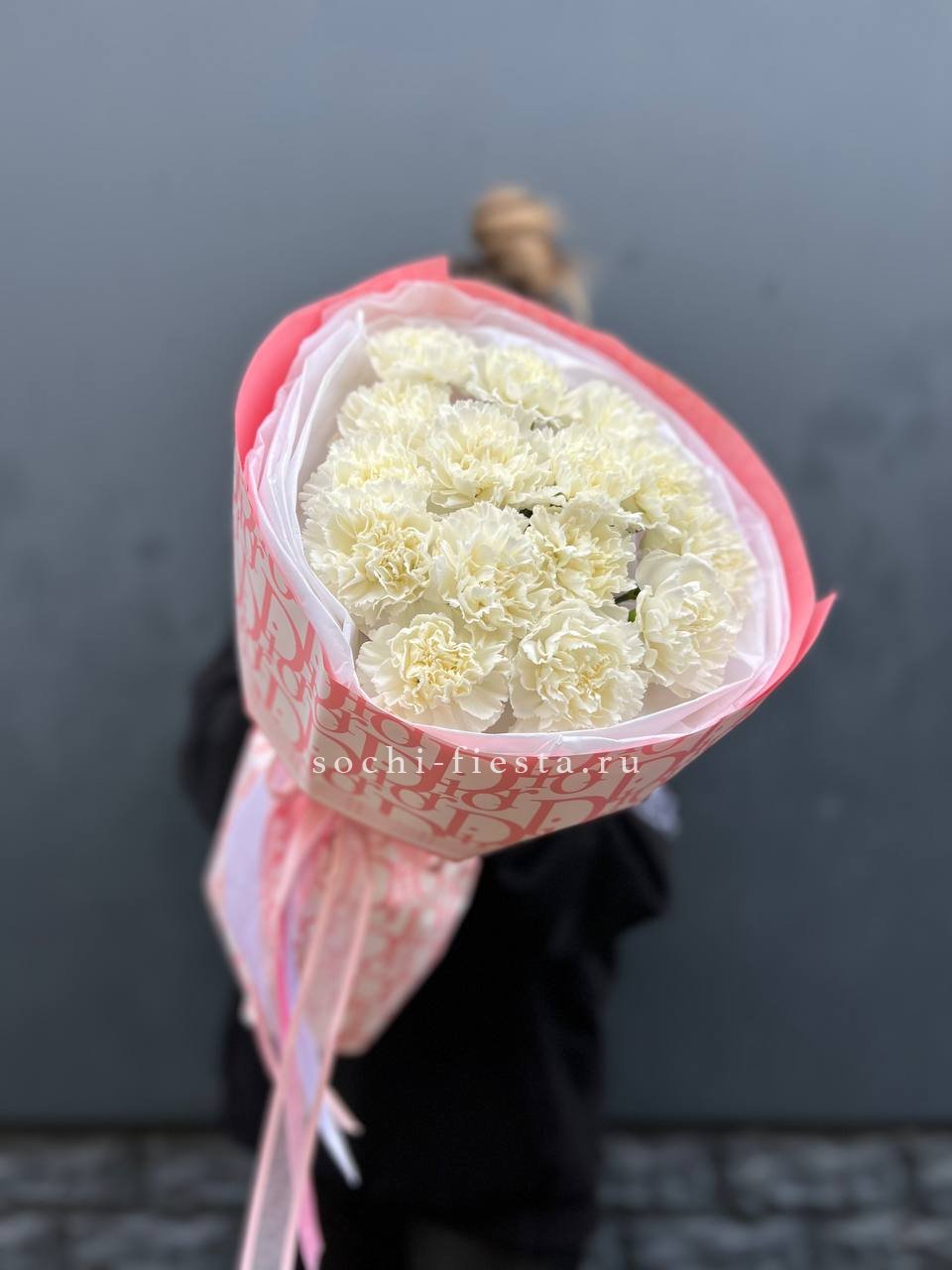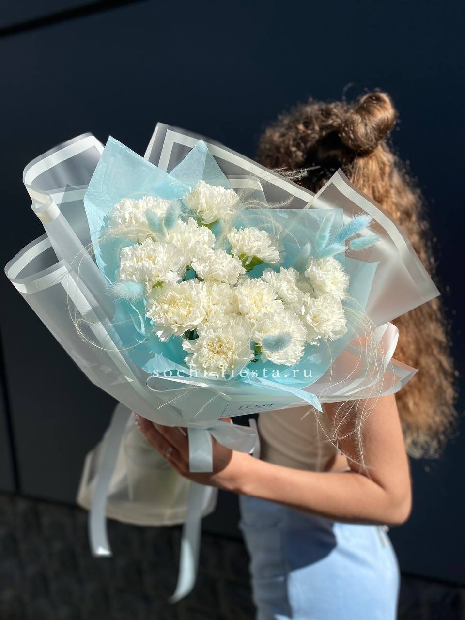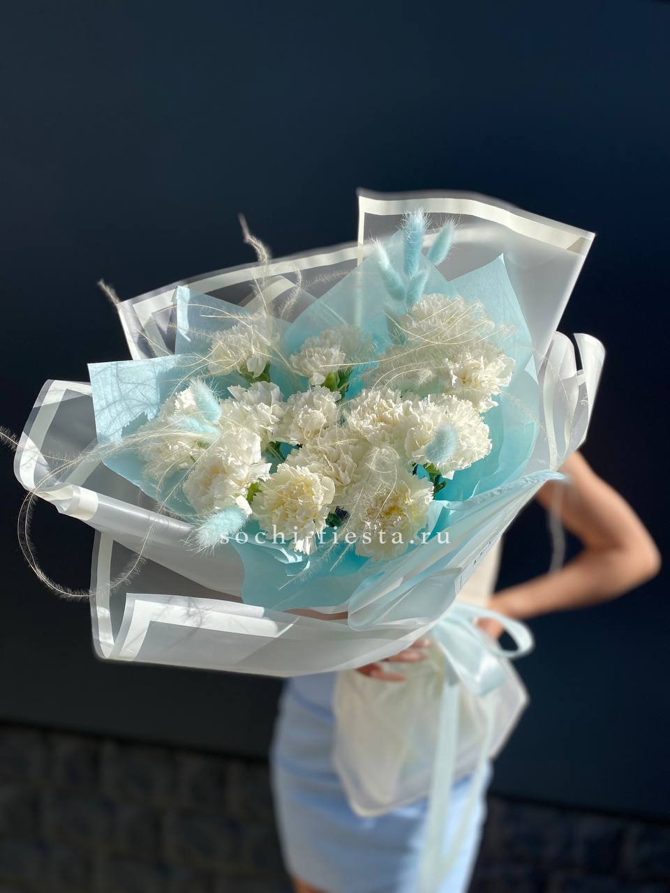 Семь кремовых диантусов раскрываются мягкими многослойными головками. Эвкалипт добавляет воздуха между бутонами и создает легкую асимметрию в общей форме.