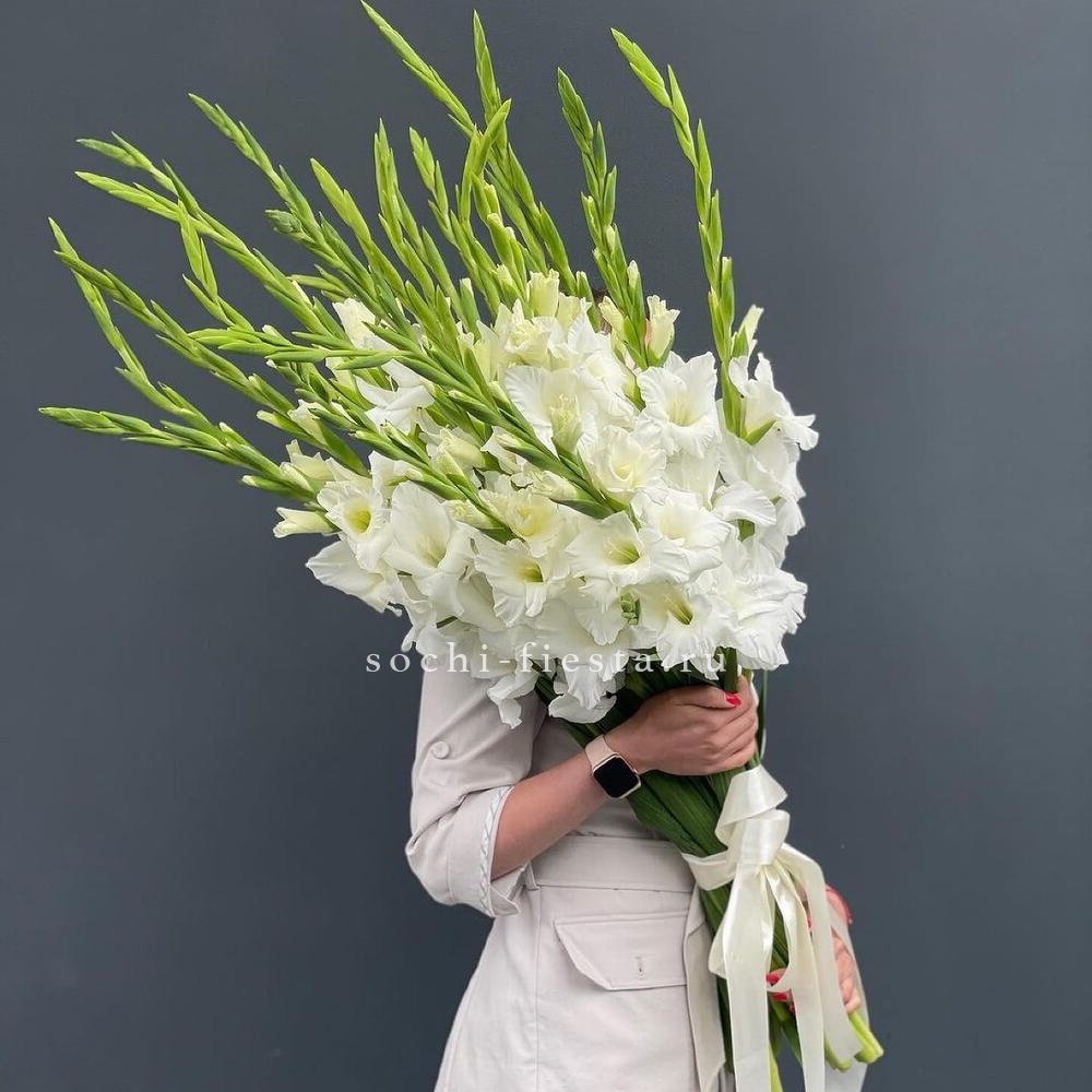 Высокие стебли белых гладиолусов собраны в строгую вертикальную композицию. Каждый цветок раскрывается постепенно, создавая живую графику от бутонов до распустившихся соцветий. Лаконичная лента завершает образ, не перегружая форму.
