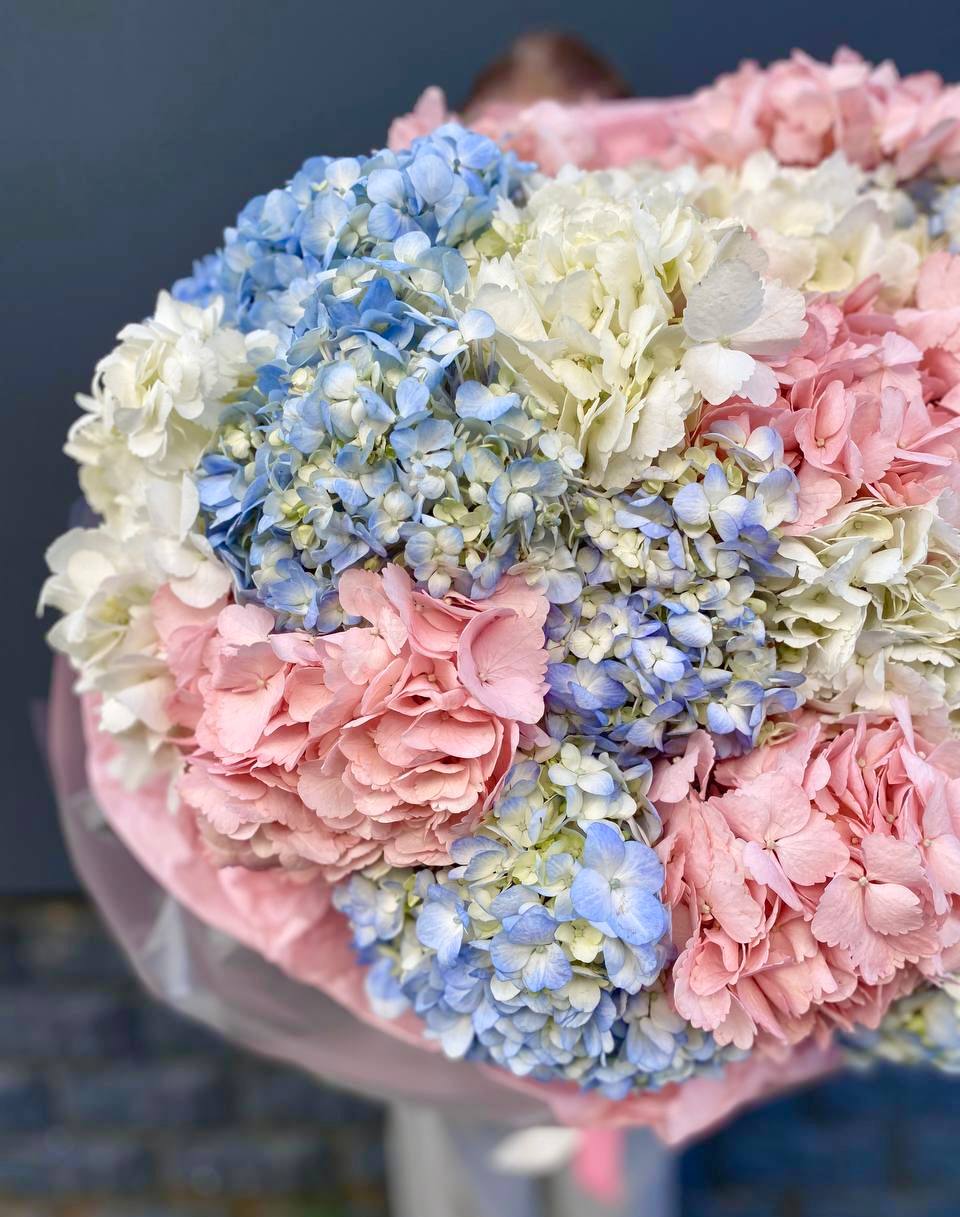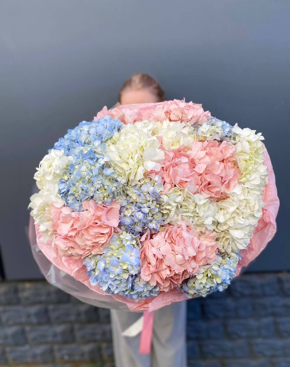 Девять пышных соцветий розовой гортензии собраны в объёмный букет с мягким градиентом оттенков. Каждая головка раскрыта полностью, создавая плотное облако лепестков.