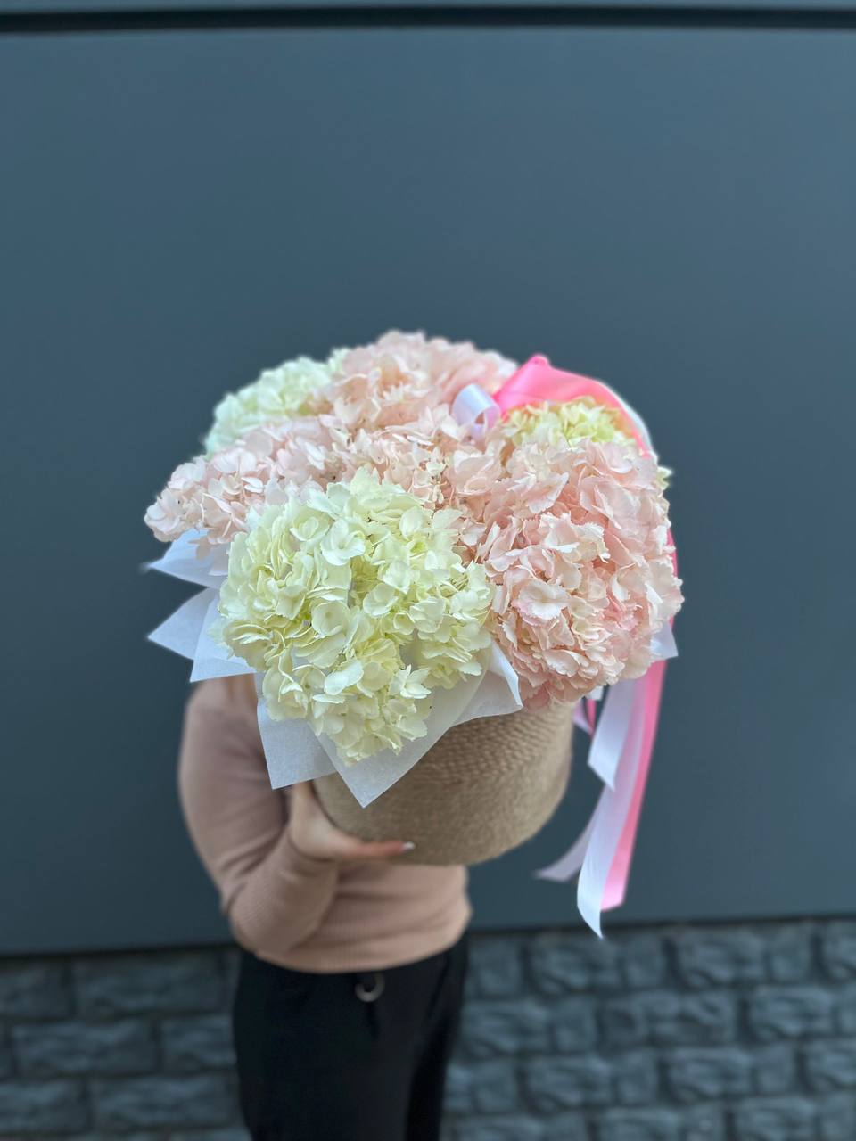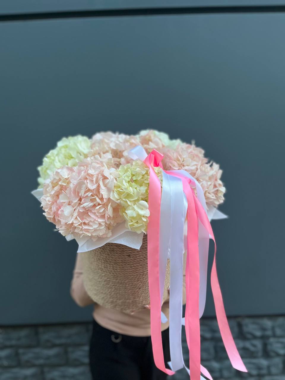 гортензия розовая 9шт., лента, дизайнерская упаковка. Цвет гортензий может незначительно отличаться.