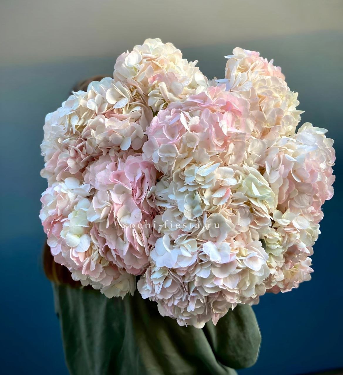 Белоснежное соцветие гортензии с плотной структурой и чистым тоном. Универсальный вариант для минималистичных интерьеров и спокойных решений.