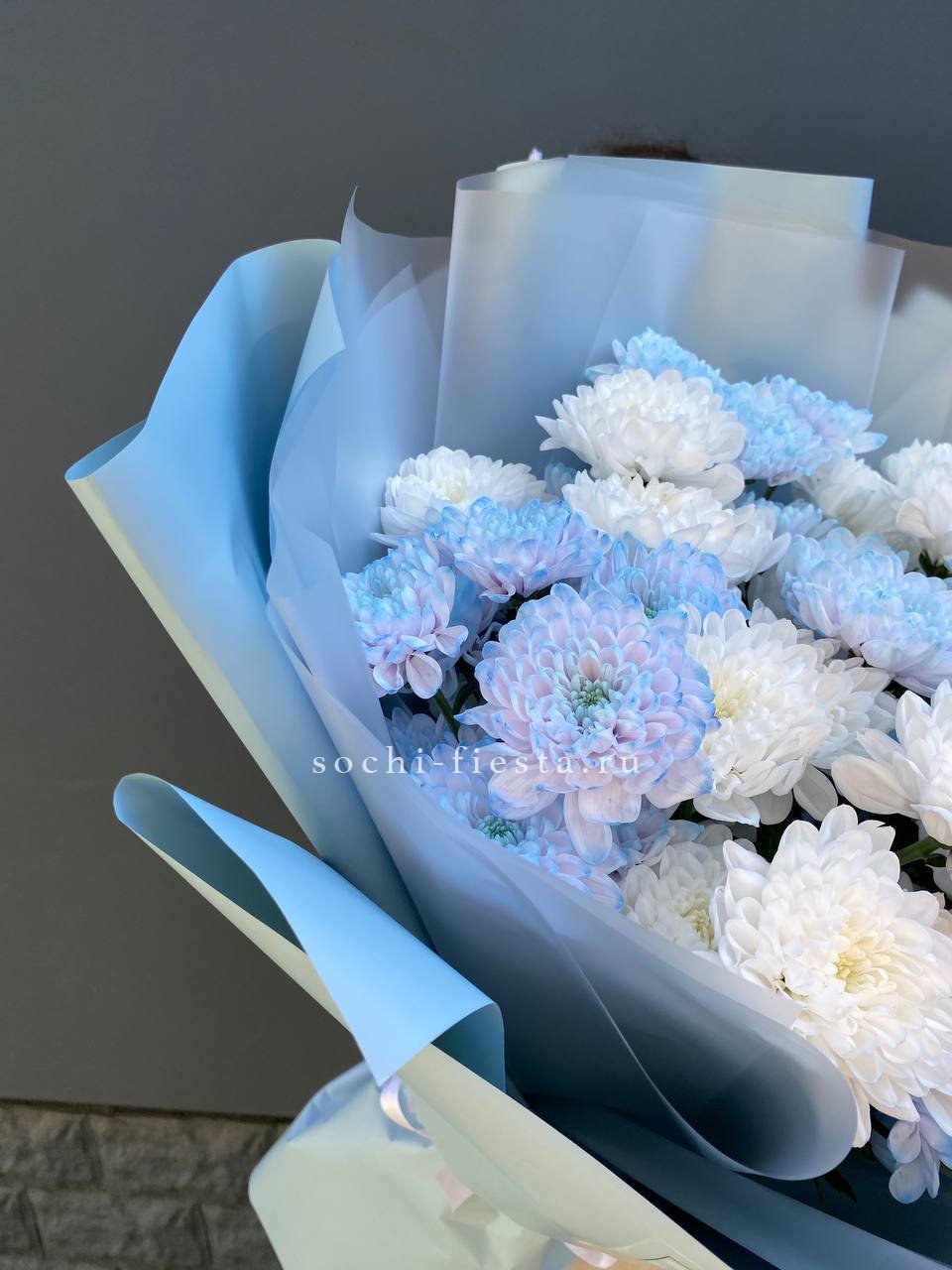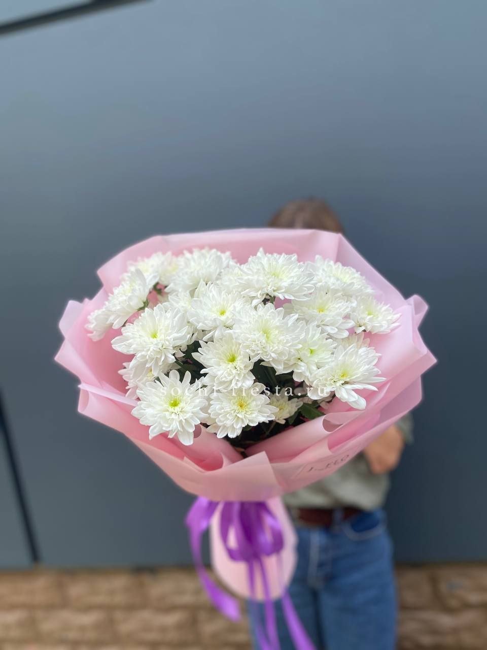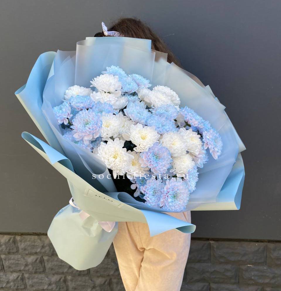 Fifteen веток кустовой хризантемы образуют пышное облако из множества мелких бутонов. Простая упаковка не отвлекает от густоты соцветий и их природной фактуры. Букет долго сохраняет свежесть и объём.