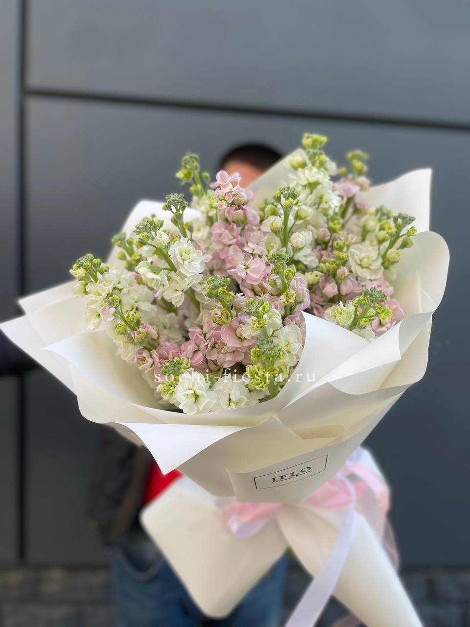 Двадцать девять веток маттиолы создают воздушное облако с насыщенным запахом и мягкими переходами оттенков. Лепестки раскрываются постепенно, меняя силуэт букета день за днём.