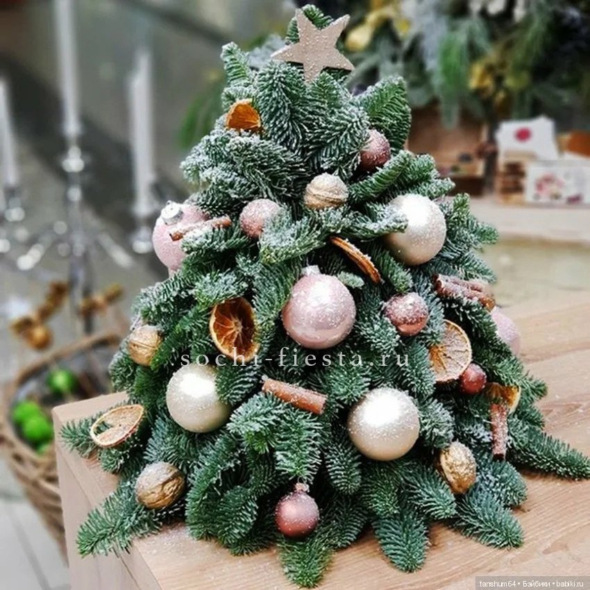 Форма ёлочки собрана из веток датского нобилиса с добавлением аспарагуса и палочек корицы. Игрушки расставлены по силуэту, создавая объём и праздничный акцент на каждом уровне.