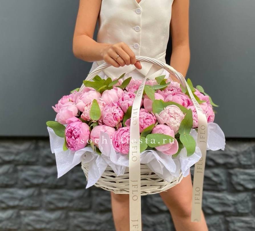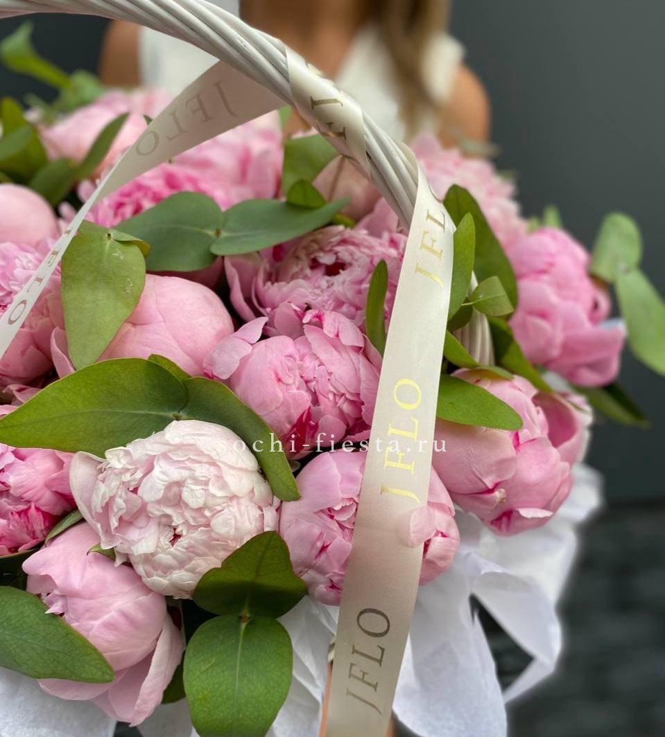 29 пионов, эвкалипт, корзина, лента.