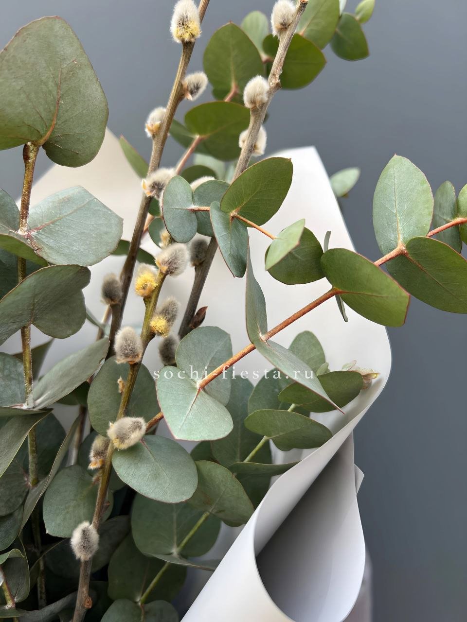 Весенняя композиция объединяет пушистые ветви вербы с бутонами белых роз и соцветиями сирени. Диантусы и озотамнус создают объёмную текстуру, а сама форма бокса делает композицию устойчивой и завершённой. Подходит для светлых праздников и семейных встреч.