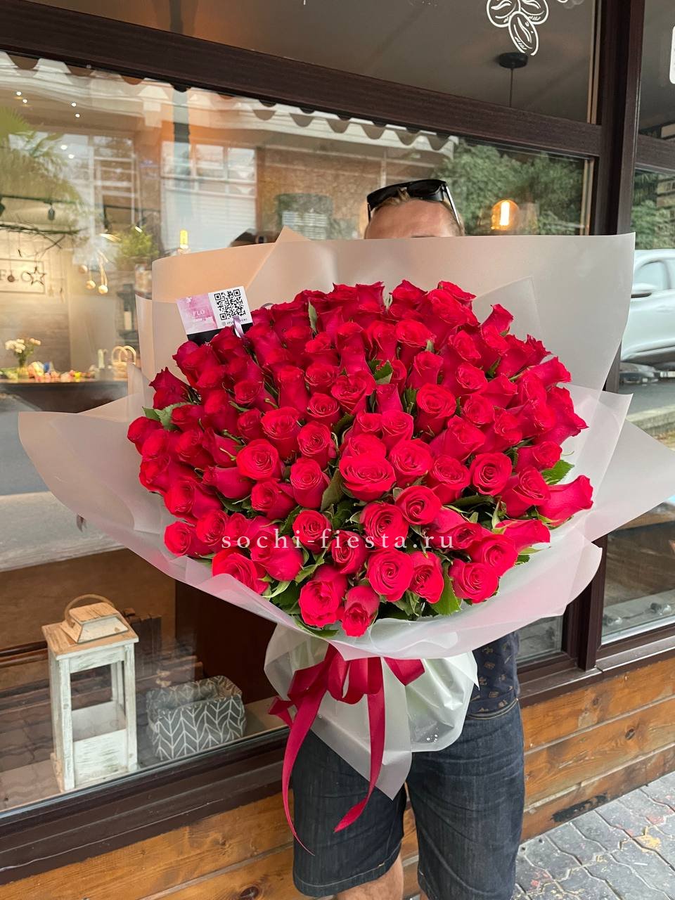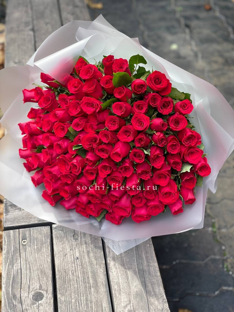 Сто одна роза белого цвета собрана в плетеную корзину и создает впечатление снежного сугроба. Такая композиция занимает пространство уверенно и притягивает взгляд своей безупречной чистотой.