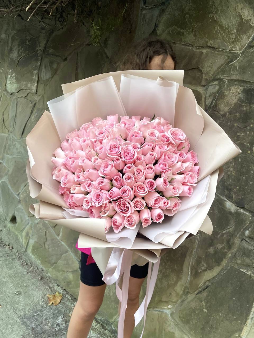 Розы Karolina раскрываются плавными переходами нежно-розовых оттенков. Сто один бутон выстраивается в плотную композицию с мягким цветовым звучанием.