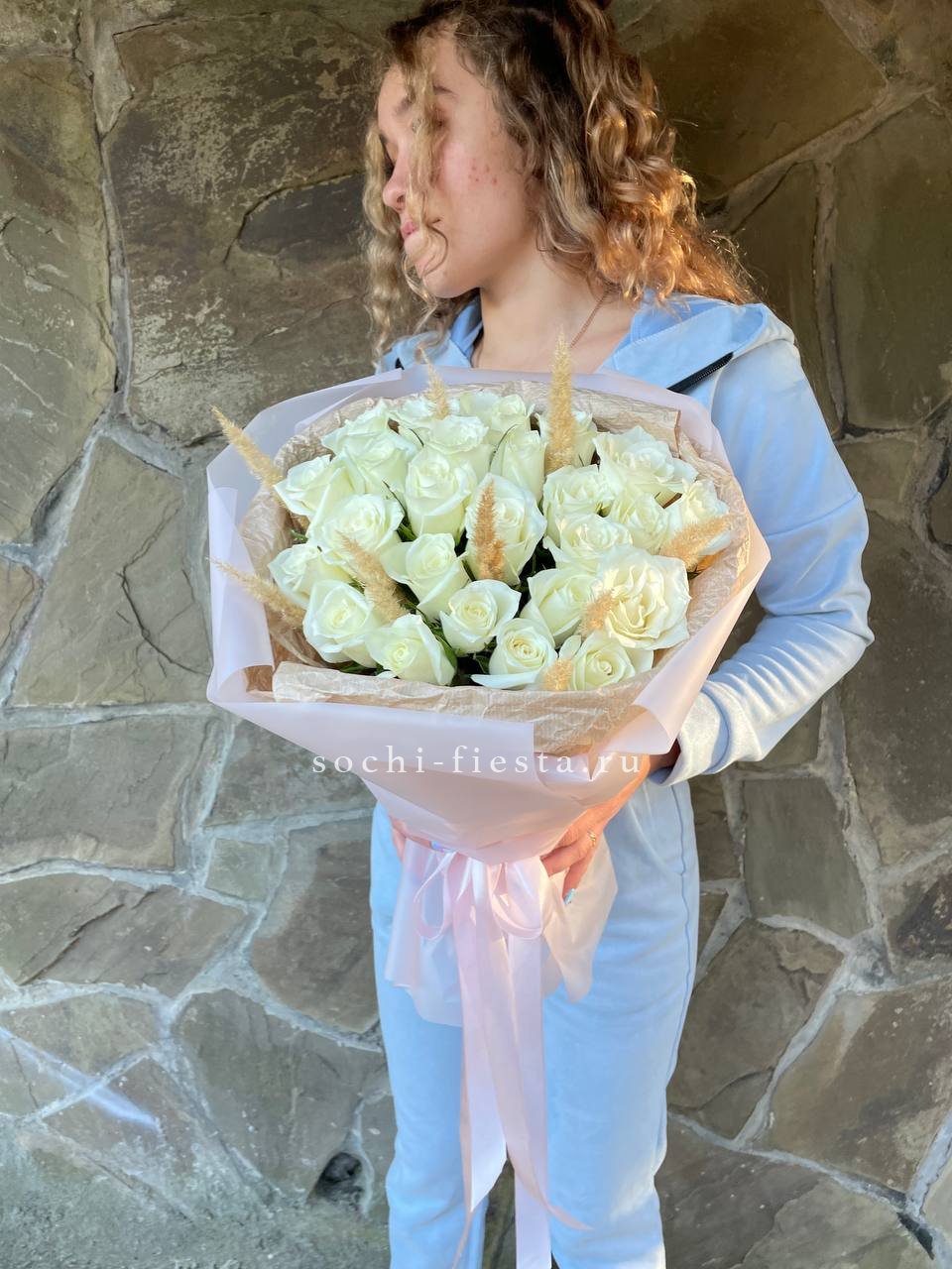 25 белых роз, сухоцветы, дизайнерская упаковка.