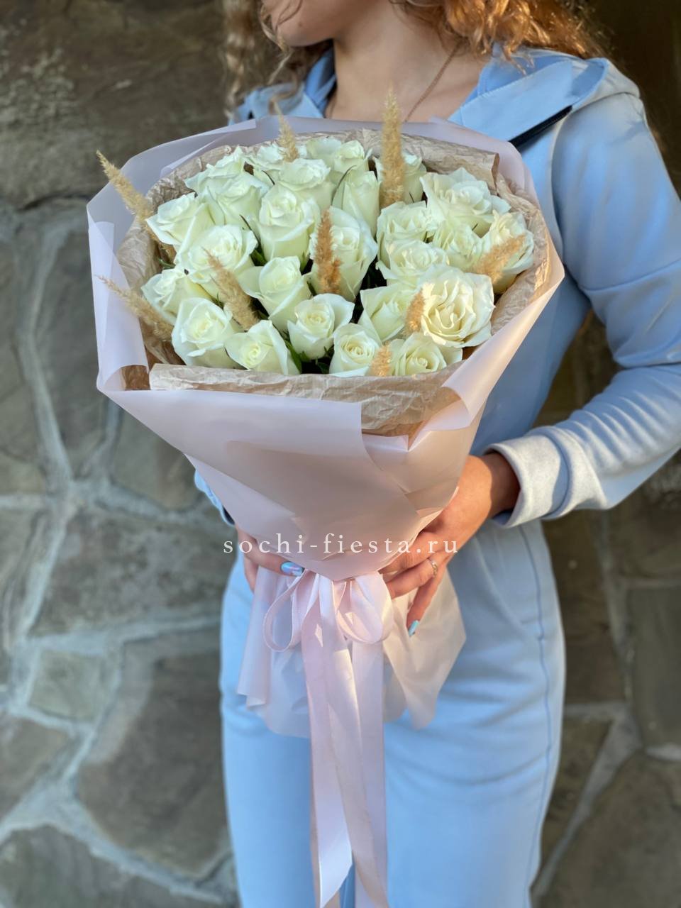 Белоснежные головки роз соседствуют с воздушными сухоцветами, создавая игру объёмов. Двадцать пять стеблей формируют насыщенную композицию с природной лёгкостью. Букет звучит свежо и живо.