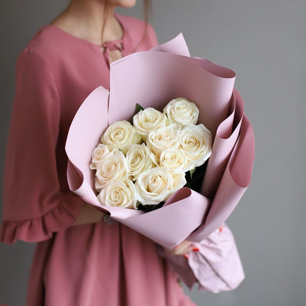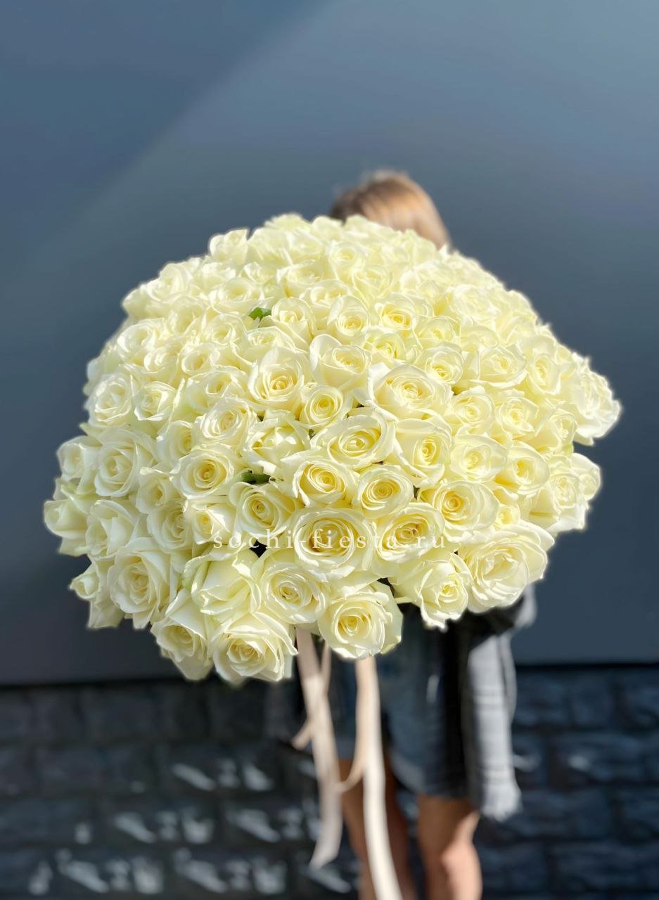 Тридцать один белоснежный бутон собран в плотную округлую форму и дополнен серебристыми ветками эвкалипта. Белый крафт сохраняет природную графику композиции и подчёркивает её объём.