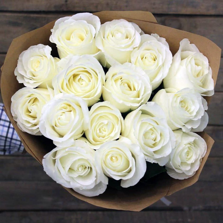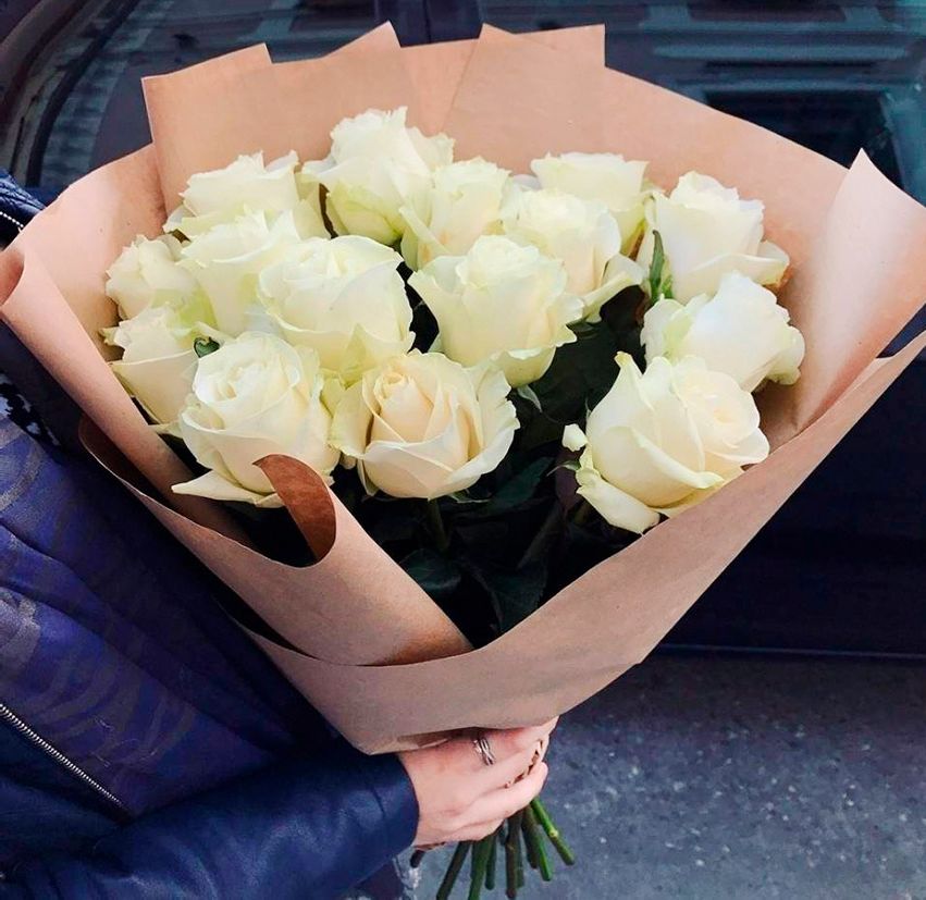 31 белая роза, лента, эвкалипт, белый крафт.