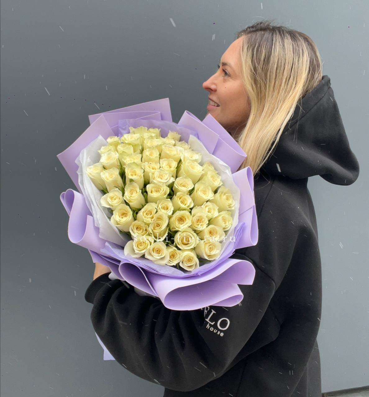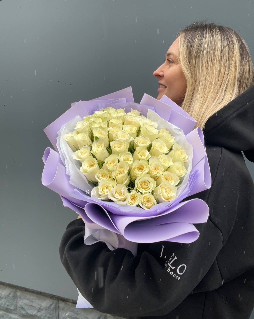 Кенийские розы отличаются небольшими плотными бутонами и выносливостью. Пятьдесят один белый цветок в обрамлении фоамирана сохраняет свежесть и форму долгое время после вручения.