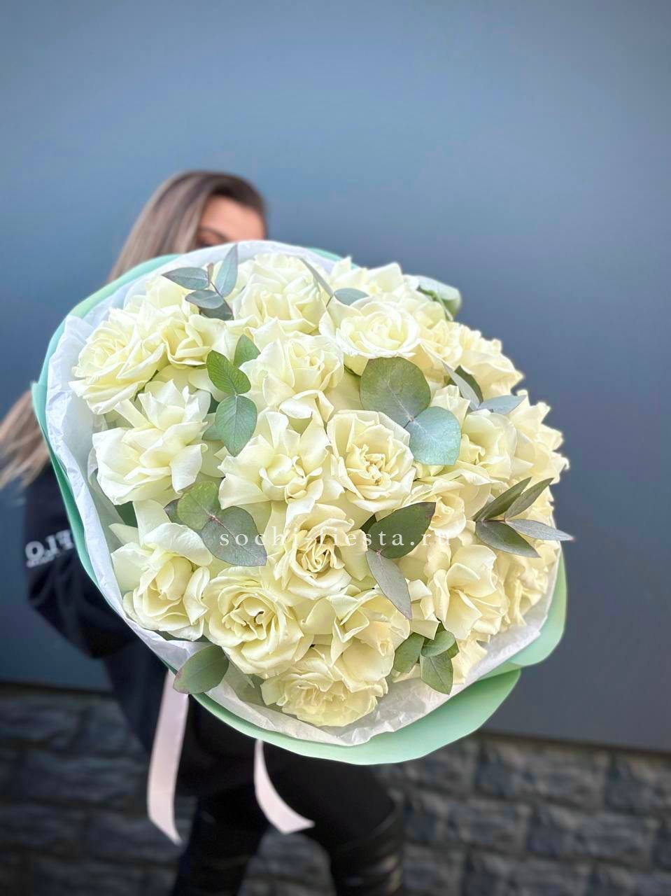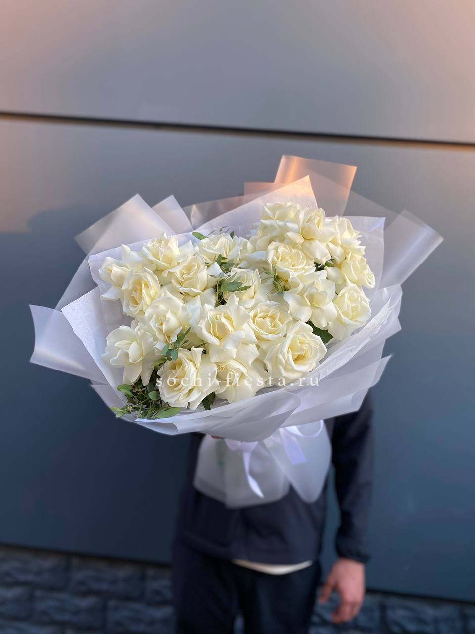 Белые розы собраны в плотную округлую форму с ровным силуэтом. Дизайнерская упаковка подчёркивает графичность линий и создаёт завершённую композицию. Букет с выразительным присутствием.