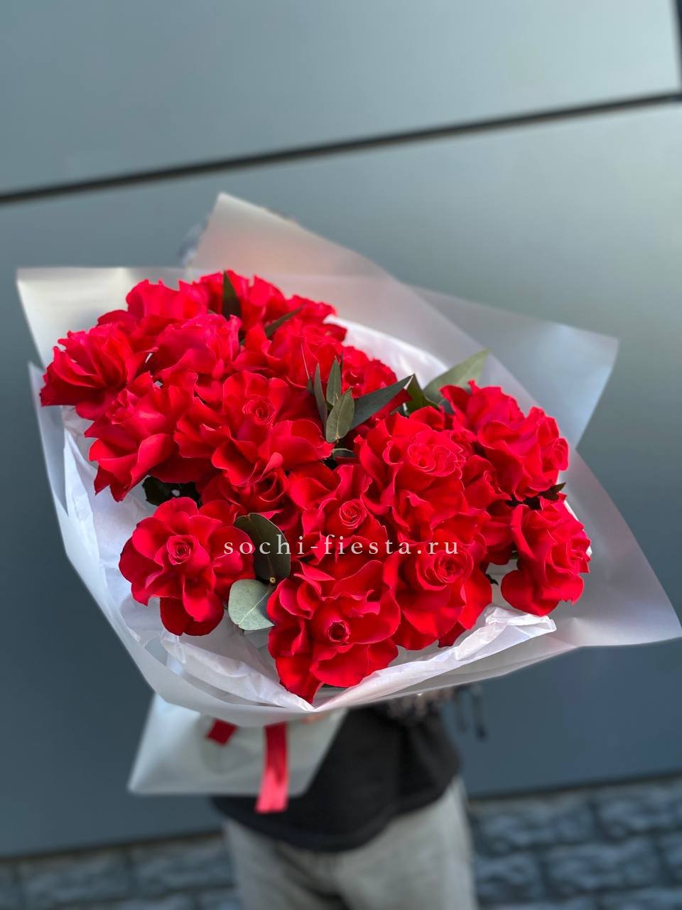 Вывернутые лепестки создают объёмную волнистую поверхность, которая меняет восприятие букета с каждого ракурса. Красный цвет звучит насыщенно и глубоко, а эвкалипт вносит лёгкую прохладу в общую картину.