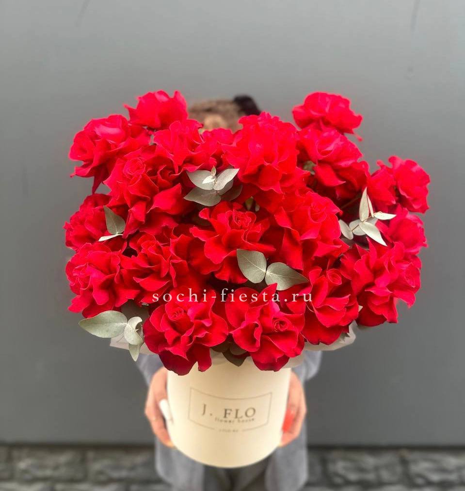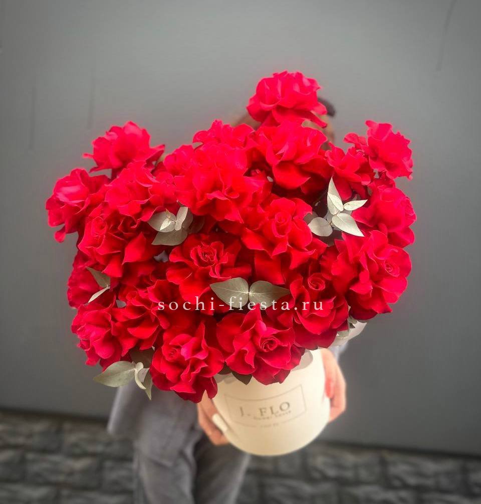 Плотная сборка из тридцати семи бутонов создает насыщенное красное пятно. Крафтовая обертка подчеркивает естественную фактуру лепестков. Букет держит форму и выглядит весомо.