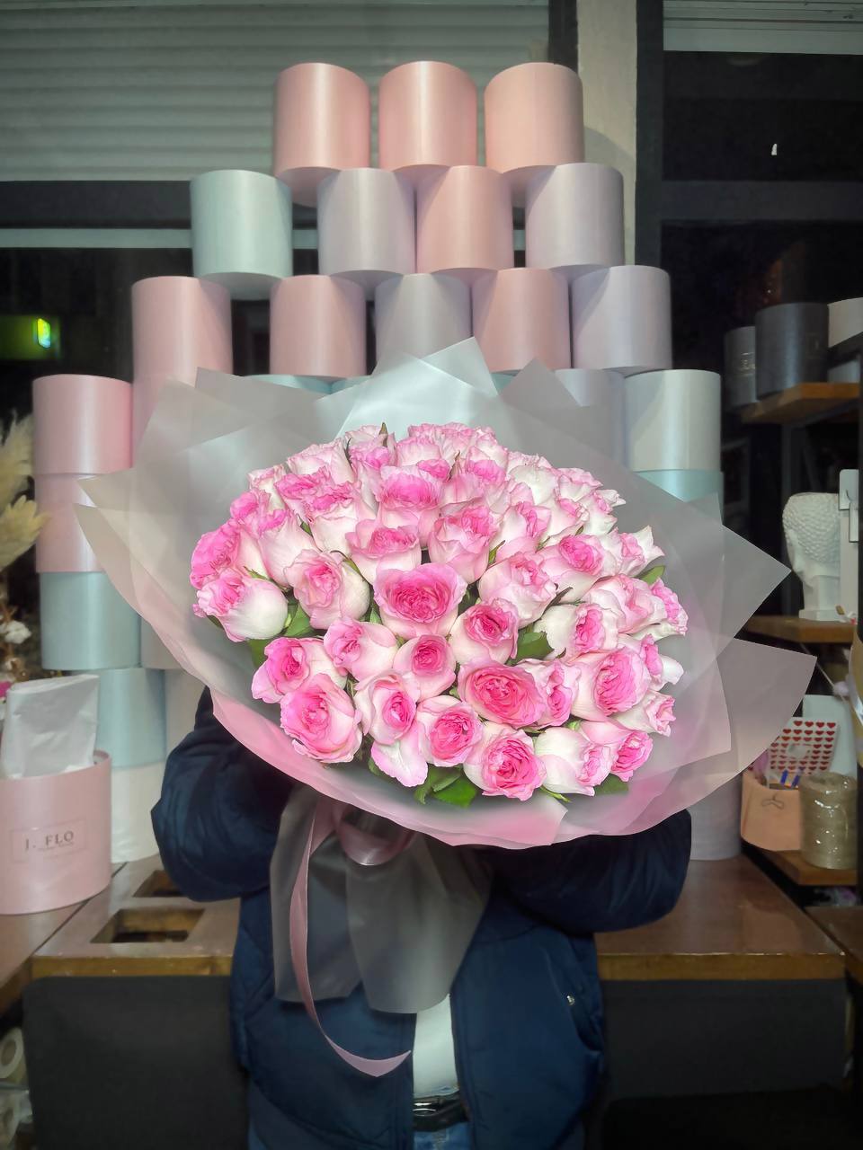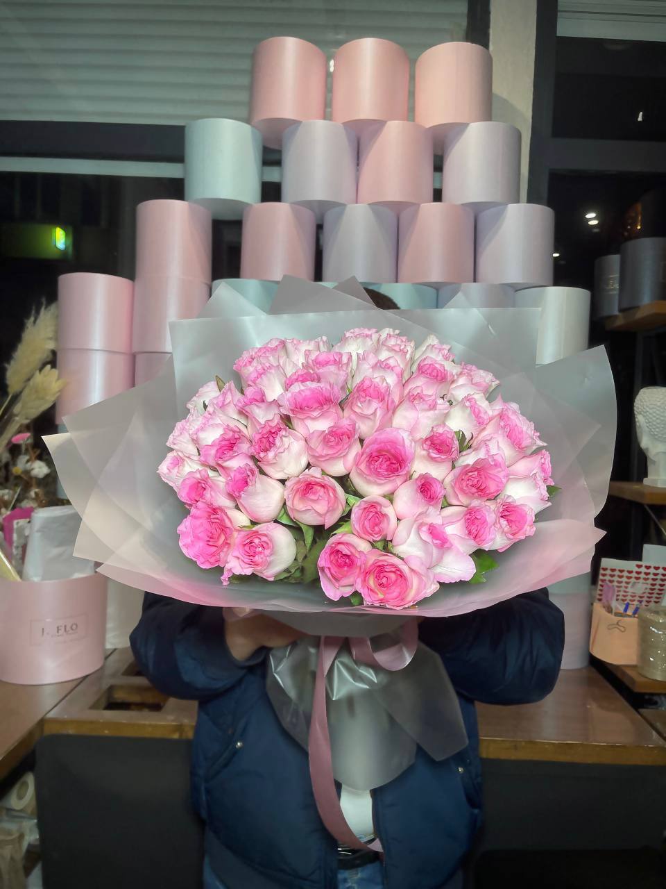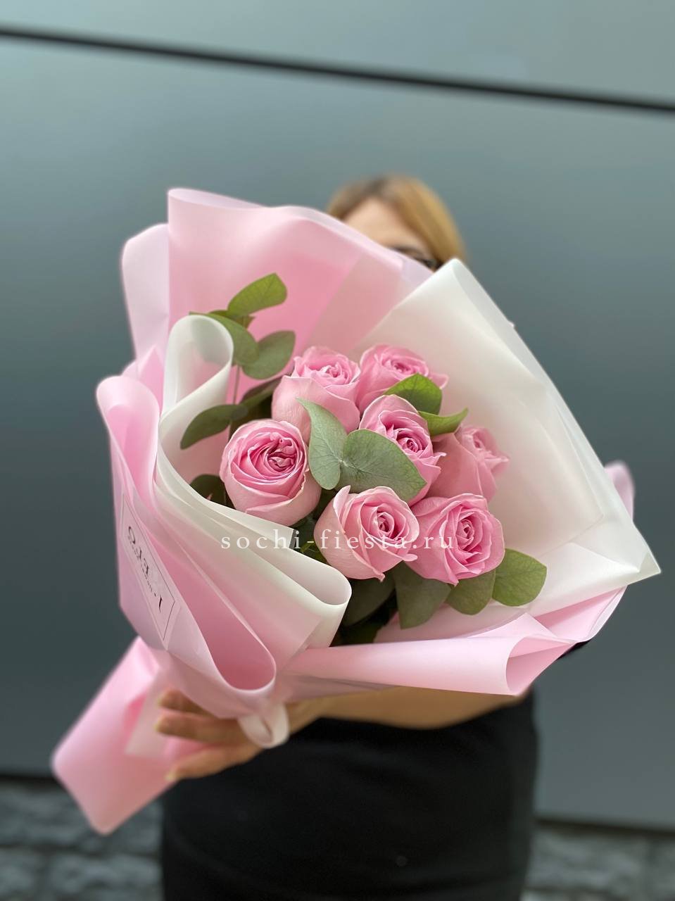 Семнадцать бутонов создают пышный объём и уверенное присутствие в любом пространстве. Розовый тон дополнен матовой зеленью эвкалипта. Букет держит форму и остаётся свежим долгое время.