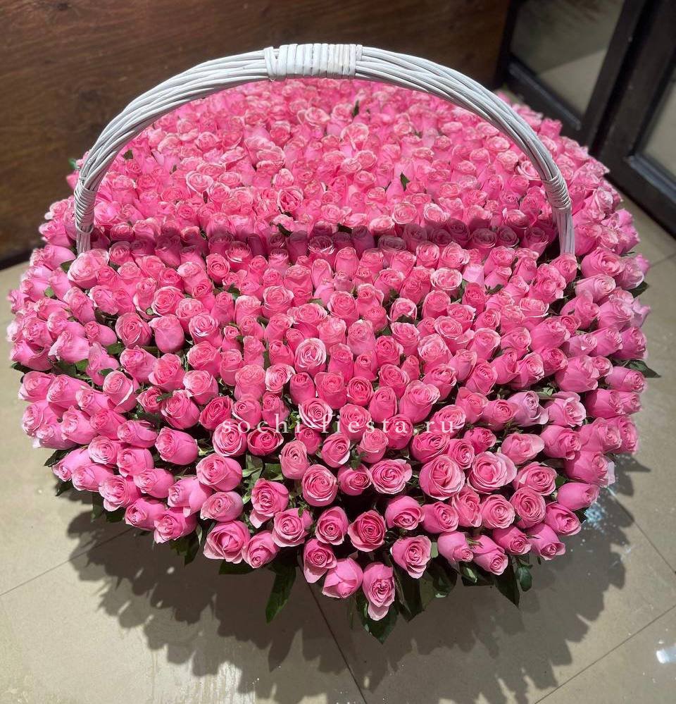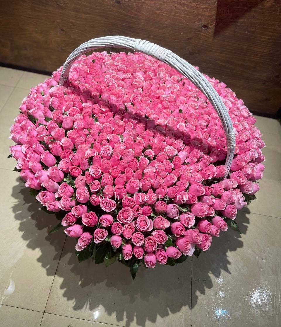 Пятьсот один бутон в корзине — это объем, который заполняет собой все вокруг. Розовый цвет разворачивается волнами, создавая почти скульптурное присутствие в интерьере.