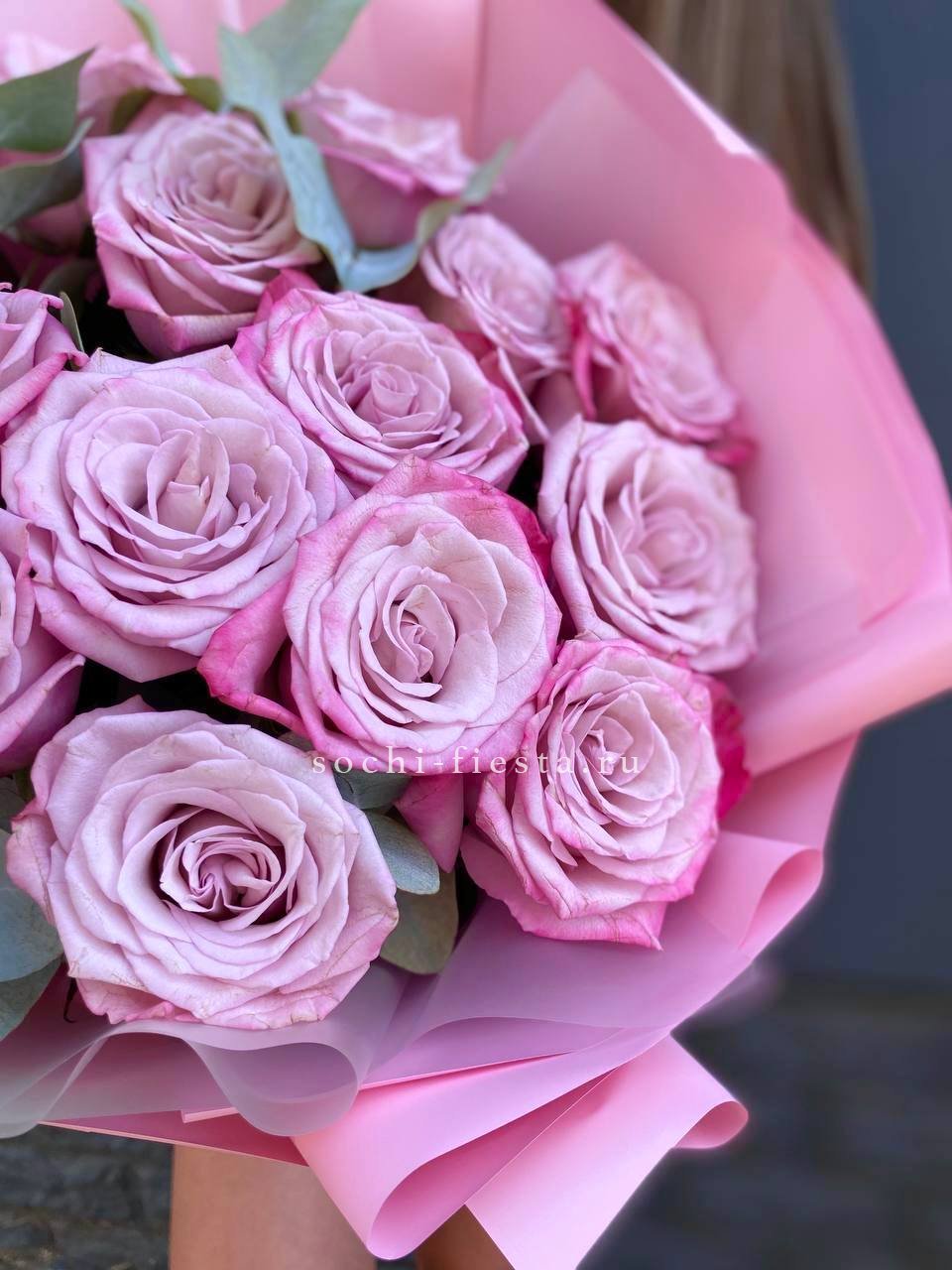 Классический розовый букет с мягкими переходами оттенков и свежей зеленью эвкалипта. Простая композиция подходит для спокойных встреч и тёплых моментов. Количество бутонов выбирается по желанию.