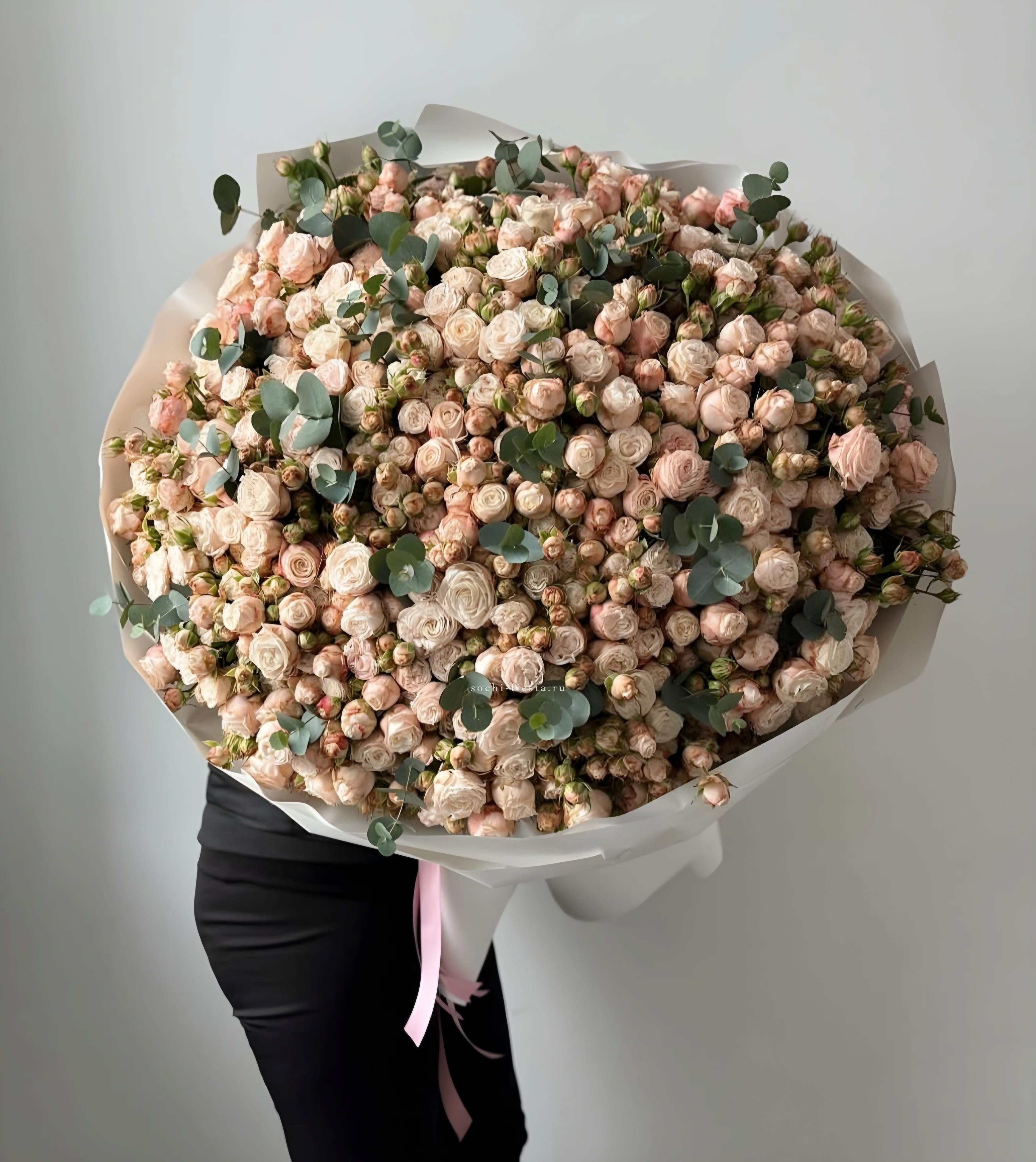35 пионовидных кустовых роз, эвкалипт, светлая корзина.