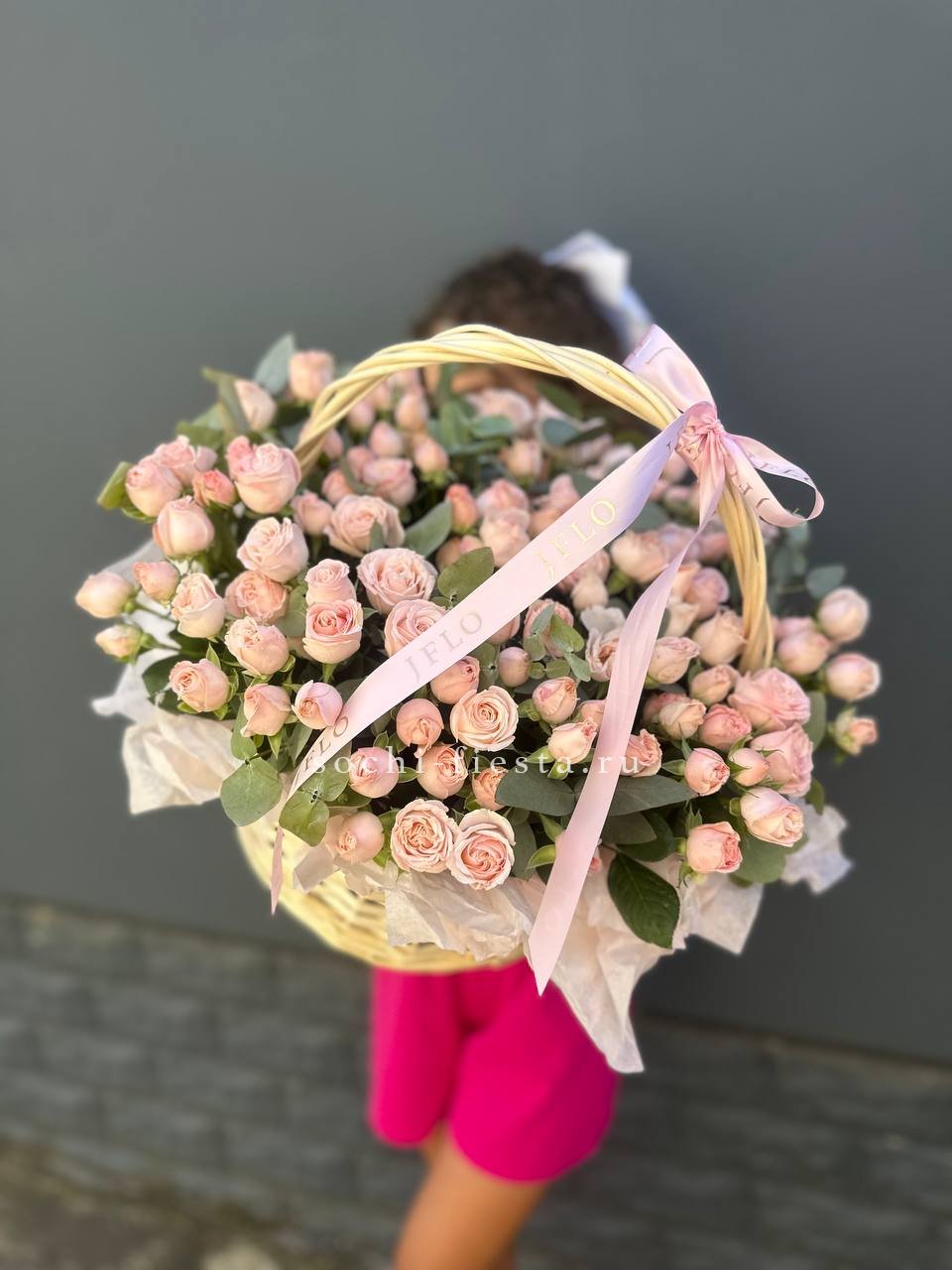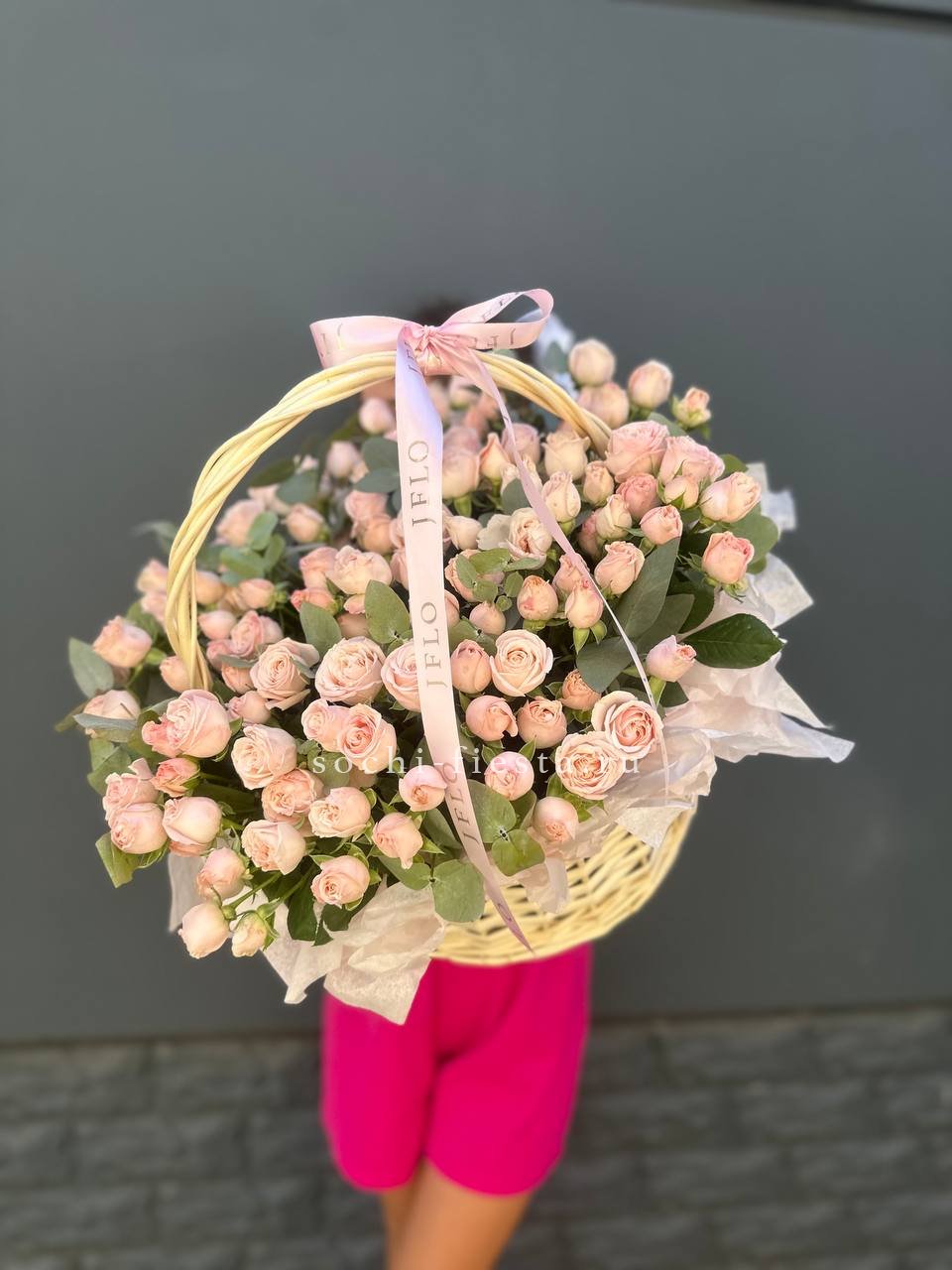 Тридцать пять пионовидных кустовых роз собраны в плетеной корзине и дополнены серебристым эвкалиптом. Округлые бутоны формируют объемную шапку светлых оттенков. Композиция легко размещается на столе и сохраняет форму.