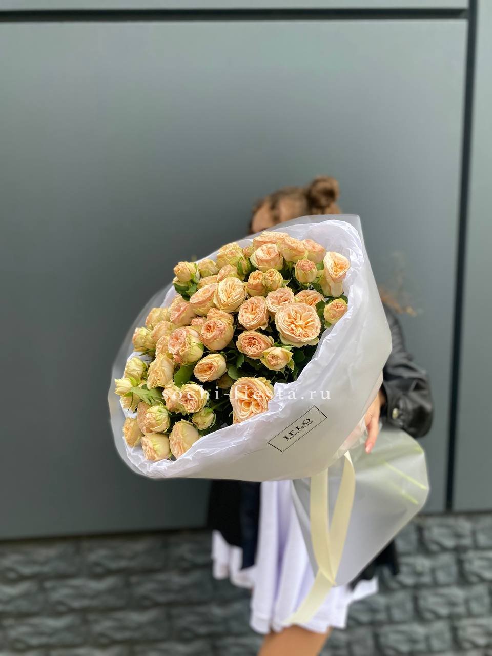кустовая пионовидная роза, лента, дизайнерская упаковка.