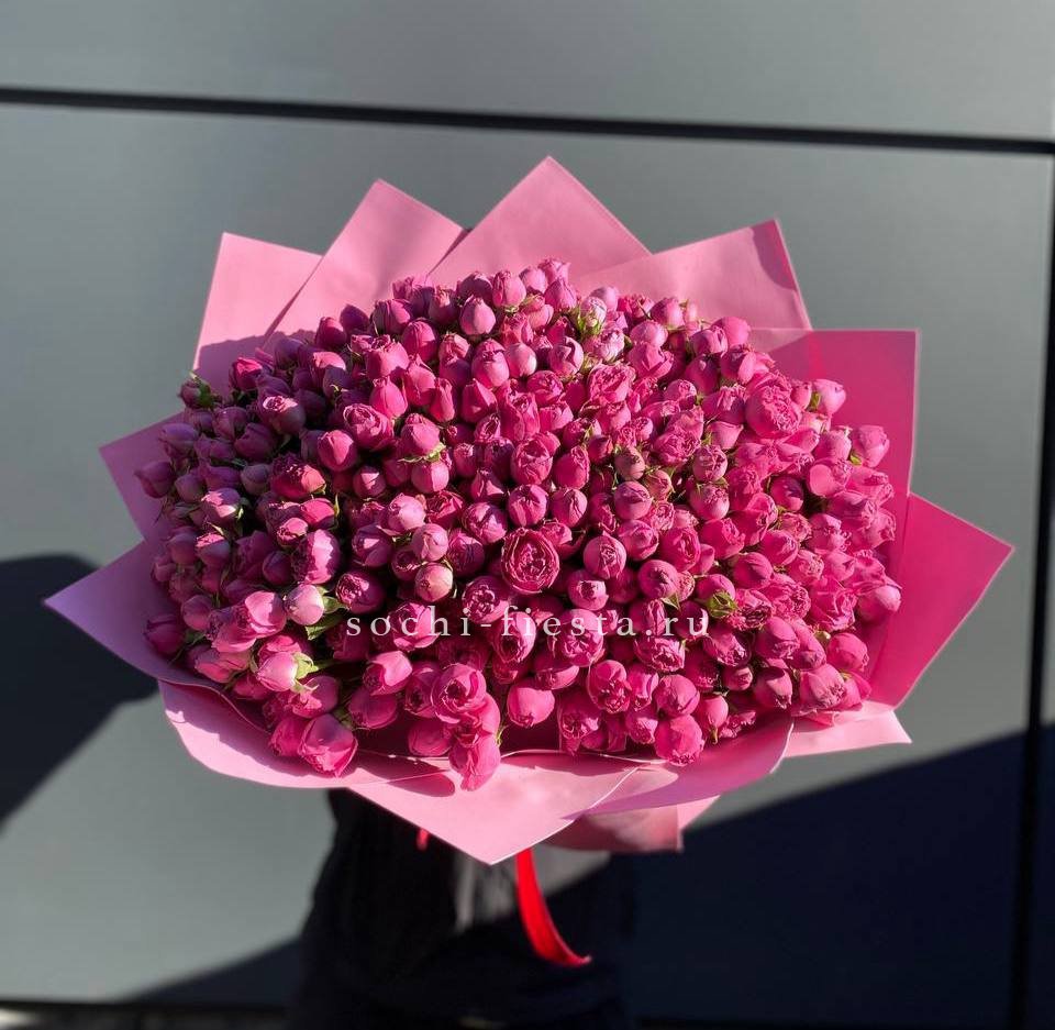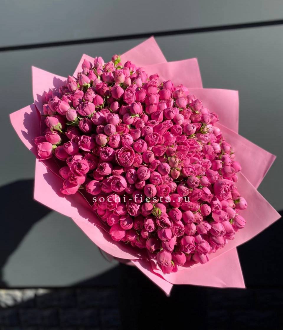 Пионовидные кустовые розы раскрываются пышными шапками, где каждый бутон живет своим ритмом. Многоцветковые стебли формируют воздушный объем, а плотность лепестков дает глубину и визуальную наполненность всей композиции.