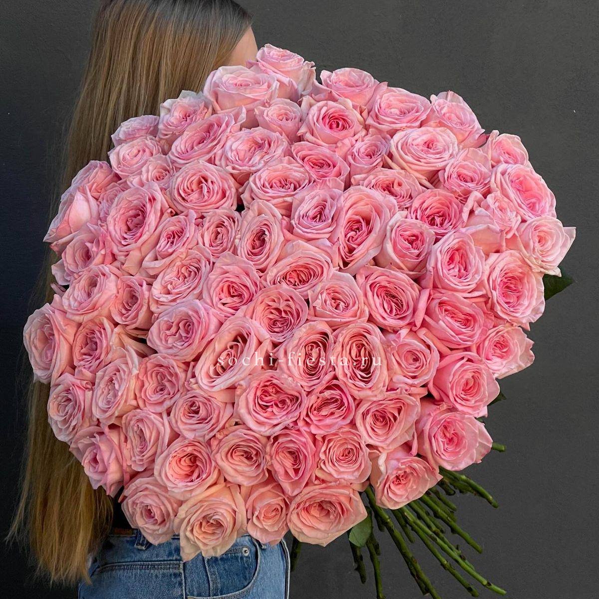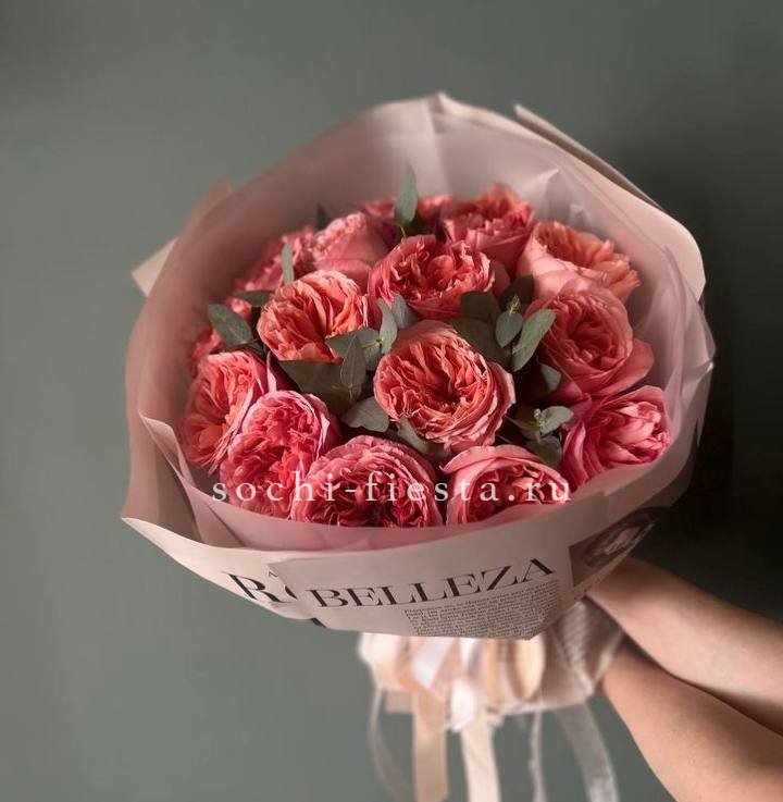 розы пионовидные 21шт, эвкалипт, пленка, лента.