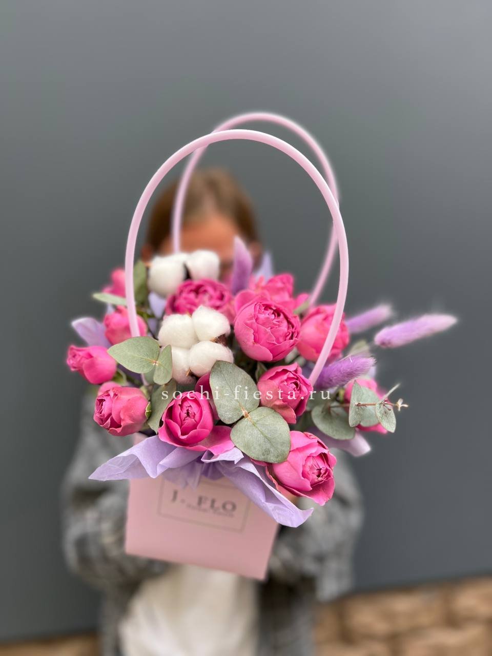 Пионовидные розы сорта Мисти с их густыми лепестками цвета пыльной розы раскрываются в небольшой сумочке. Хлопок и эвкалипт смягчают плотность бутонов. Камерный формат подходит для близкого расстояния.