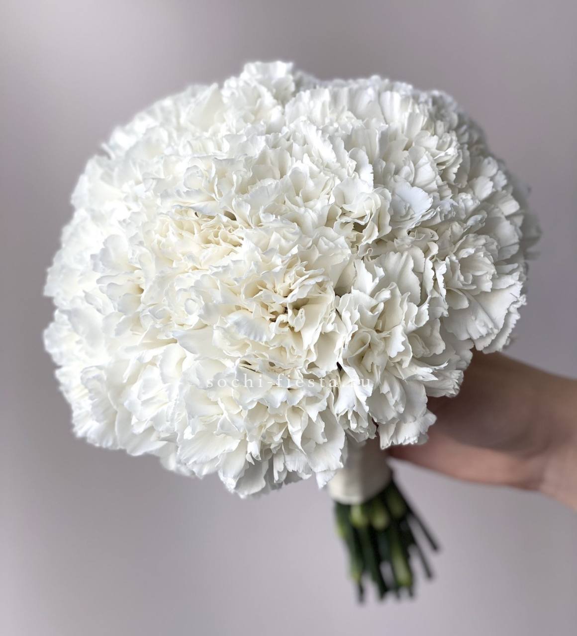 Двадцать один белоснежный диантус собран в округлую форму классического свадебного букета. Плотная структура и чистота линий подходят для церемонии.